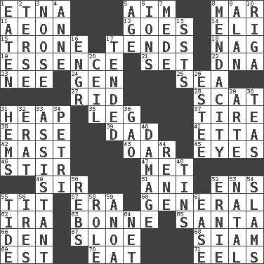 ACROSS 1. Inactive volcano in Sicily 5. Direct toward a target or goal 8. Third mo. 11. A really long time 12. Travels 14. Biblical high priest 15. Marketplace scale 17. Is inclined (to) 18. Tired old horse 19. Core 21. Arrange properly for use 22. Heredity factor (abbr.) 23. Born 24. Commissioned mil. rank 25. Ocean 27. To free from 28. Leave at once 31. Pile 35. Part of a journey 37. Hoop that covers a wheel 38. Celtic language 39. Male parent 41. Singer James 42. Vertical spar for supporting sails 43. Rowing implement 45. Snake ____ (dice throw) 46. Agitate 47. Was introduced to 49. Title for a knight 51. Cuckoo 52. Followers of ems 55. Teat (slang) 57. Epoch 60. Commissioned military rank 62. Retirement account (abbr.) 63. Child's nurse 65. Before Barbara or Clara 66. Lair 67. _ gin 68. Thailand, formerly 69. Eastern Standard Time (abbr.) 70. Ingest 71. Snakelike fish DOWN 1. Eroded 2. Laconic 3. Trap for birds or small mammals 4. Singer Murray 5. Personal question 6. Charged particles 7. Ancient Persian 8. Ananias' fault 9. ____ Jay Lerner 10. Port city in Latvia 13. Fast planes 16. Engineer (abbr.) 17. Watched over 20. To provide with a ceiling 26. First name in cosmetics 29. Johnson of "Laugh-In" 30. Beverages made from leaves 31. Folds over and sews together 32. Part of Q.E.F. 33. Helper 34. _ dish (used to culture cells) 36. E Mali city 40. Break 44. French philosopher Descartes 48. Airtight sealed metal containers 50. Confederate soldiers (slang) 52. Bert's buddy 53. Brizilian seaport 54. Criticizes harshly 55. Periodic rise and fall of the sea level 56. Angers 58. Hero or heavy, e.g. 59. Small Philippine buffalo 61. Relaxation 64. Fish or hair follower
