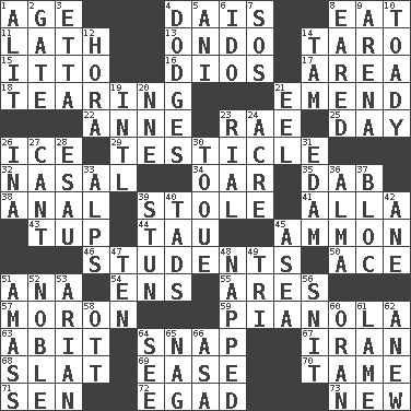 ACROSS 1. Mature 4. Raised platform 8. Erode 11. Thin strip of wood or metal 13. Southwest Nigerian state 14. Edible starchy tuberous root 15. "Tell ____ the Marines!" 16. "Vaya con ____" 17. Type of rug 18. Pulling into pieces 21. Make improvements or corrections to 22. Singer Murray 23. Actress Charlotte 25. 24 hours 26. Frozen water 29. One of the two male reproductive glands 32. Relating to the nose 34. Rowing implement 35. Pat or tap gently 38. Of or related to the anus 39. Took without asking 41. Silent film actress Nazimova 43. Uncastrated adult male sheep 44. The 19th letter of the Greek alphabet 45. ID or VA city 46. SAT takers 50. Adept person 51. Santa ___, CA 54. Followers of ems 55. Ancient Greek god of war 57. Person of subnormal intelligence 59. Player piano 63. "This won't hurt ____!" 64. Fastener 67. SW Asia republic 68. Narrow board 69. Comfort 70. Not wild 71. Elected rep. 72. Mild oath 73. ___ Haven, CT DOWN 1. Set down 2. Yard entry 3. Singer James 4. Evades 5. Black tropical American cuckoo 6. Wedding promise 7. Mayday 8. Having ears or earlike features 9. Sports stadium 10. Sycophant 12. Israeli folk dance 14. Scottish cap 19. International (abbr.) 20. Compass dir. 21. Snakelike fish 23. Monetary unit of Yemen 24. 1/640 square mile 26. _ tizzy (2 wds.) 27. Patter 28. Son of Isaac 30. Woman's close-fitting hat 31. Dutch treat 33. High mountains 36. _ mater 37. Group of countries in special alliance 39. Surprise greatly 40. Small boys 42. One (Scot) 45. Toward the sea 47. "___ Little Indians" 48. Slept 49. Three (prefix) 51. Collect or gather 52. Impressive in appearance 53. Believer in; advocate of (suffix) 56. In a ____ (agitated or irritated) 58. Baseball player Mel 60. Northwest Algerian city 61. Unable to walk 62. Afresh 64. Observe 65. Tired old horse 66. White ___ sheet