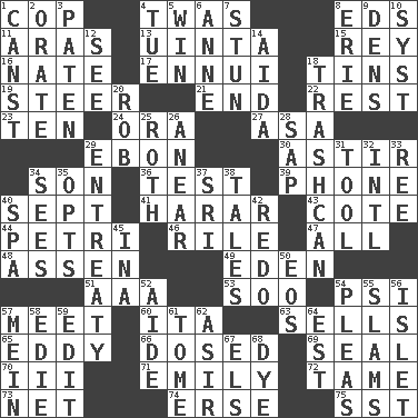 ACROSS 1. Police officer (slang) 4. It was, poetically 8. Begley and Asner 11. Caspian sea tributary 13. National forest in Provo, Utah 15. Marina Del _, California 16. Nathan's nickname 17. World-weariness 18. Metal containers 19. Navigate 21. Conclusion 22. Repose 23. "___ Little Indians" 24. Mouth or opening 27. White ___ sheet 29. Inky black, to poets 30. Having gotten out of bed 34. Male child 36. Trial 39. Give a jingle 40. Back-to-school mo. 41. Ethiopian city, capital of Harari 43. ____ d'Azur (French Riviera) 44. _ dish (used to culture cells) 46. Cause heat under the collar 47. 100% 48. NE Netherlands city 49. Paradise 51. American Automobile Association (abbr.) 53. "Barney Miller" actor Jack 54. Air pressure measure (abbr.) 57. Rendezvous 60. Call ___ day 63. Exchanges for money 65. Whirlpool 66. Administered medicine 69. Lick closed 70. One more than two 71. Poet Dickinson 72. Docile 73. Fish or hair follower 74. Celtic language 75. Fast jet (abbr.) DOWN 1. 2nd pers. sing. pres. of can (arch.) 2. Declaim 3. Eucharist need 4. Third day of the wk. 5. Victory 6. Singer Murray 7. Make senseless or dizzy 8. 4th largest of the Great Lakes 9. Cub Scout units 10. System (abbr.) 12. Perceive with the eye 14. Opera by Verdi 18. File 13 20. Director Reiner 25. Writer of Portnoy's Complaint (1969) 26. Approach 28. Plant excrement 29. Plea 31. Implement 32. International (abbr.) 33. To separate or throw off 34. Perceives with the eye 35. Chooses 37. Indian title of respect (Mr.) 38. Falsehoods 40. Health resort 42. Make new 45. _ tizzy (2 wds.) 50. Greek goddess of the dawn 52. Assistant 54. Entreaties 55. Criticizes harshly 56. Small island 57. Chow _ 58. Singer Brickell 59. Prepare for publication 61. Heavy book 62. SW Saudi Arabia district 64. Eastern Standard Time (abbr.) 67. Raised railways 68. Color