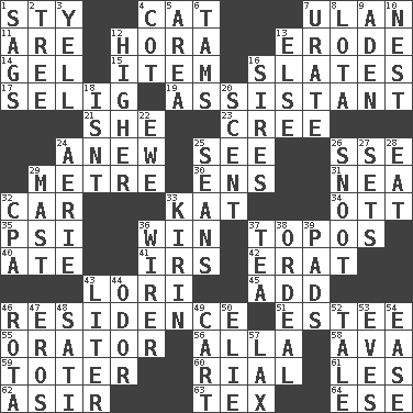 ACROSS 1. Filthy place 4. Domesticated feline 7. ____ Bator, Mongolia 11. "We ___ not amused" (Victoria) 12. Israeli folk dance 13. Wear away 14. Set 15. A distinct part 16. Chalkboards 17. Former Milwaukee Brewers owner Bud 19. Aide 21. A female animal or person 23. Algonquian 24. Afresh 25. Observe 26. Compass dir. 29. Distance measurement (Brit.) 30. Followers of ems 31. Teachers' org. 32. 4-wheeled motor vehicle 33. Krazy ___ of comics 34. Baseball player Mel 35. 23rd letter of the Greek alphabet 36. Victory 37. Traditional theme or motif 40. Had dinner 41. Big collection agency 42. Part of Q.E.F. 43. Australian parrot (variant) 45. Increase 46. Dwelling 51. First name in cosmetics 55. Speaker 56. Silent film actress Nazimova 58. Actress Gardner 59. Carrier 60. Monetary unit of Yemen 61. French article 62. SW Saudi Arabia district 63. John Ritter's dad 64. Compass dir. DOWN 1. Settles 2. Woody plant 3. Shout 4. Small bed 5. Type of rug 6. Scottish caps 7. A salt of uric acid 8. Globular water bottle used in Asia 9. An important port of Yemen 10. Egg locale 12. Having greater elevation 13. Otherwise 16. Titles for men of rank and authority 18. Is not 20. Odor 22. She-sheep 24. Nest on high 25. Seines 26. Snob 27. Arranges properly for use 28. Ingest 29. Vertical spar for supporting sails 32. Tax preparer (abbr.) 33. Japanese brewing company 36. One who wires 37. Beverage made from leaves 38. Severe or trying experience 39. Writing tablets 43. 61 cubic inches 44. Aroma 46. Roll call or roster of names 47. Greek god of love 48. Suttee (variant) 49. Haul 50. Writer Wiesel 52. Falsehood 53. Nights before holidays 54. Comfort 57. Not strict