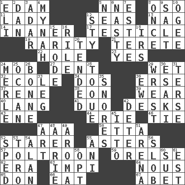 ACROSS 1. Dutch treat 5. Compass dir. 8. Bear (Spanish) 11. Kenny Rogers chart-topper in '80 12. Oceans 13. Tired old horse 14. Sillier 17. One of the two male reproductive glands 19. Noteworthy scarcity 21. Cigar-shaped 22. Hollow 23. It is so 24. Disorderly crowd 27. Scratch 29. Soggy 32. Learning spot: Fr. 34. Two (Sp.) 36. Celtic language 37. French philosopher Descartes 38. Age 39. Put on (as clothing) 40. Austrian-born American filmmaker Fritz 41. Superhero pair 42. Writing tables 43. Compass dir. 44. 4th largest of the Great Lakes 46. Make a knot 47. Auto club (abbr.) 50. Singer James 52. A viewer who gazes fixedly 55. Michaelmas daisies 57. Coward 59. Threatening words 62. Epoch 63. Body of Kaffir warriors 64. Common sense 65. Spanish title 66. Ingest 67. Collude with DOWN 1. Connecticut Ivy Leaguer 2. Daniel's nick name 3. The sixth month of the Jewish calendar 4. Non-adult bird? 5. Born 6. Smutty 7. First name in cosmetics 8. Single time 9. Table seasoning 10. Double curve, resembling the letter S 12. Filthy place 15. Eat (away) 16. Cause heat under the collar 18. Big collection agency 20. Watched over 24. Haggard of country music 25. Sea 26. Child's nurse 28. Woman's close-fitting hat 29. Obtain by seizing forcibly or violently 30. 1973 Nobel Price Winner (Physics) Leo 31. Laconic 33. Part of a journey 35. Sounds asleep 36. She-sheep 42. Prevent from occurring 45. "Tell ____ the Marines!" 47. Nonscientific branch of learning 48. Nest on high 49. Odor 51. Sports stadium 52. Moved rapidly 53. "Corrida" creature 54. ____ Jay Lerner 55. Black tropical American cuckoo 56. Messy guy 58. Elect 60. Take to court 61. Eastern Standard Time (abbr.)
