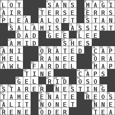 ACROSS 1. Car dealer's back yard 4. Without 8. Wise men 12. Wind 13. Laconic 14. Blunders 15. Entreaty 17. High up in or into the air 18. Comedian Laurel of Laurel & Hardy 19. Deli grouping 21. Help 23. June honoree 24. Turn to the right 26. Area sheltered from the wind 27. Among 28. "______ My Girl" (Turtles hit) 30. Cuckoo 31. Spoke pompously 34. Head covering 37. Cartoonist voice _ Blanc 38. Indian princess (variant) 39. Mouth or opening 40. Leather borer 41. Burden 42. Atlas unit 43. Prong on a fork 44. Smile enhancers 46. Set 47. To free from 50. Bear (Spanish) 51. A viewer who gazes fixedly 54. Nestling 57. Not wild 58. Related on the mother's side 60. Vintage cars 62. Set down 63. Music written for nine 64. Compass dir. 65. French philosopher Descartes 66. Baltic tributary 67. Afternoon social gathering DOWN 1. Pet locale 2. Lubricates 3. Excercise machine 4. Major League Baseball Commissioner Bud 5. Came up 6. Overdraft (abbr.) 7. Bristle 8. Makes clutter 9. Nick name for Arthur 10. Pate de foie ____ 11. Is not 13. Scottish cap 16. Mountain range southwest of Kyrgyzstan 20. Find the sum of 22. Downhill vehicle 25. First name in cosmetics 27. Afresh 29. The bottom of a shoe or boot 30. Nanny (var.) 31. NW Algerian seaport 32. More uncommon 33. Also 34. Piece 35. Caspian sea tributary 36. Infant food 41. Do some clerical work 43. Cylindrical with tapered ends 44. Small bed 45. SW Saudi Arabia district 46. Street urchin 48. Silly 49. Prevent from occurring 51. Play the lead 52. Story 53. Former U.S. Attorney General Janet 55. Put into a specified state 56. Went 59. Dreamland 61. Ocean