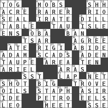 ACROSS 1. Coat; cloak 4. Crowds into 8. Quiet! 11. 1/640 square mile 13. Less widely known 15. River (Sp.) 16. Lick closed 17. Feeling or showing extreme anger 18. Deli pickle 19. Eating place 21. The 19th letter of the Greek alphabet 22. Small island 23. Followers of ems 24. Chief or king in Benin or Nigeria 27. Forbid 29. Russian ruler of old 30. Match 34. Had dinner 36. Swiss mountan, "Queen of the Mountains" 39. Stay 40. First of billions? 41. Large numbers or amounts 43. Arabian gulf 44. Grayish beige 46. Length times width 47. "___ Little Indians" 48. Satellite of Uranus 49. Ancient river in northeast Turkey 51. Fast jet (abbr.) 53. Infant locale 54. Fish or hair follower 57. Attempt 60. Of large size 63. Collection of objects 65. Lubricates 66. Staphylococcus 69. SW Saudi Arabia district 70. Binary compound 71. Stone: prefix 72. Snakelike fish 73. Lion 74. Confront 75. Compass dir. DOWN 1. Clothes sense 2. Sea 3. Catches 4. Medical imaging device (abbr.) 5. Boat paddle 6. Naughty child 7. Bristle 8. Indian titles of respect 9. Land elevation 10. Opening into or through something 12. Pipe bend 14. Reuben's nickname 18. Empty-headed or silly people 20. Greek goddess of the dawn 25. Long, evenly shaped pieces 26. N. Chile seaport 28. American Automobile Association (abbr.) 29. Storms 31. Travel on or in a vehicle 32. Genesis locale 33. Car or cant ending 34. The sixth month of the Jewish calendar 35. "Change" in Tahitian 37. Slender fish 38. Standard of perfection 40. "One Day ___ Time" 42. "Two Mules for Sister ____" 45. Raised railways 50. Fitting 52. Cook's measure (abbr.) 54. Olfactory organs 55. Vices 56. Laconic 57. Earth 58. Flintstone garb 59. Margarine 61. Detail 62. Yard entry 64. Actress Charlotte 67. Before (prefix) 68. Being at a high temperature