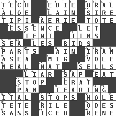 ACROSS 1. Technical 5. Singer Brickell 9. Of the mouth 13. _ vera 14. (Had) reclined 15. The founder of a family 16. Native american tent (variation) 17. Nest on high 18. Haul 19. Substance 21. Allow 22. Portable shelter 23. Canisters 24. Ocean 27. French article 28. Auction offers 29. Actors' quests 31. The 18th letter of the Arabic alphabet 32. SW Asia republic 36. Toward the sea 37. Russian fighter aircraft 38. Grand slam 39. Be tempered by heat 40. Floor covering 41. Exchanges for money 42. One who doesn't tell the truth 44. Plant excrement 46. Consume 47. Halt 48. Part of Q.E.F. 50. Baking dish 51. Rending 54. Slanted text style (abbr.) 56. Constricts 58. Undercover agent 60. Wig 61. Cause heat under the collar 62. Lyric poems 63. Backtalk 64. On the rocks 65. French philosopher Descartes DOWN 1. Make lace 2. Writer Wiesel 3. 911 reaches them 4. Robbery 5. Chooses 6. Have the gumption 7. One more than two 8. Compass dir. 9. Clearly or manifestly demonstrative 10. Debaucheries 11. Tate display 12. Area sheltered from the wind 17. Singer Murray 20. Snakelike fish 21. Hat (slang) 23. Metal container 24. Connect, as a bridge 25. Comfort 26. Type of rug 28. Large 30. Baron Munchausen's specialties 31. Small island 33. Hero or heavy, e.g. 34. Silent film actress Nazimova 35. A home for chicks 37. Impair 40. Atlas unit 41. Practice fight 43. Electrically charged atom 44. Oozed 45. Ancient river in northeast Turkey 47. Arguments over trivial matters 49. Southeast Indonesia island 51. Lacquered or enameled metalware 52. Thickened enlargement 53. Small, secluded valley 54. ___ a Wonderful Life 55. Beverage made from leaves 56. Indian title of respect (Mr.) 57. Nervous spasm 59. Compass dir.