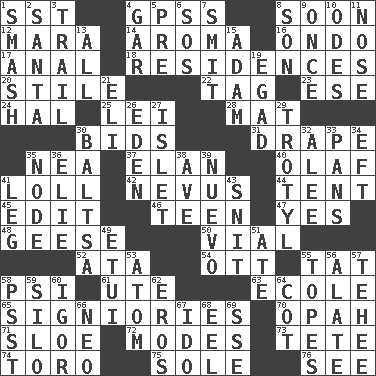 ACROSS 1. Fast jet (abbr.) 4. Global Positioning Systems (abbr.) 8. Within a short period 12. Hindu Mythology: god of death 14. Odor 16. Southwest Nigerian state 17. Of or related to the anus 18. Dwellings 20. Vertical member of a panel or frame 22. Label 23. Compass dir. 24. Actor Linden 25. Flowery wreath 28. Floor covering 30. Auction offers 31. Window treatment 35. Teachers' org. 37. Enthusiasm 40. Norwegian king 41. Hang loosely or laxly 42. Mole, birthmark 44. Portable shelter 45. Prepare for publication 46. Adolescent 47. It is so 48. Honkers 50. Small bottle 52. _ moment's notice (2 wds.) 54. Baseball player Mel 55. Make lace 58. Air pressure measure (abbr.) 61. Shoshoni 63. Learning spot: Fr. 65. Seigniories (variant) 70. Brightly colored fish 71. _ gin 72. Methods 73. False hair 74. "Corrida" creature 75. Flatfish 76. Perceive with the eye DOWN 1. Box-office sellout 2. Before Barbara or Clara 3. Get behind 4. Slender fish 5. Before (prefix) 6. Mayday 7. Stricken, poetically 8. Male child 9. Single time 10. Lyric poems 11. Sense of smell 13. 100% 15. First of billions? 19. Mild oath 21. Biblical high priest 26. Genesis locale 27. Small island 29. TNT 30. Greek mezzo-soprano Agnes 32. Toward shelter 33. Baking dishes 34. Newt 35. Thickened enlargement 36. Writer Wiesel 38. "___ Maria" 39. New (sp.) 41. Part of a journey 43. In a ____ (agitated or irritated) 49. Needle holder 51. Had dinner 53. Smallest unit of an element 55. Drinks excessively 56. Having winglike extensions 57. Giggle 58. Inconspicuous attention getter 59. Grain storage tower 60. Composer Stravinsky 62. Greek god of love 64. Small bed 66. Modern: prefix 67. Wedding promise 68. Snakelike fish 69. Compass dir.