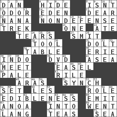 ACROSS 1. One of the 12 tribes of Israel 4. Flintstone garb 8. Is not 12. Aroma 14. Paradise 15. Letter starter 16. Grandmother 17. Unrelated to defense, as in spending 20. Long journey 21. Single 22. Had dinner 23. Rends 27. Stricken, poetically 29. Utensil 31. Stupid person 34. Eating place 35. One of the Great Lakes 36. _ china 39. Movie disc 41. Toward the sea 42. Confront 43. Artist's stand 46. Light colored 47. Cause heat under the collar 48. Ancient river in northeast Turkey 51. Synchronize (abbr.) 54. Put into a specified state 56. French article 58. Hero or heavy, e.g. 61. The property of being fit to eat 66. Give off 67. Small Philippine buffalo 68. To the inside or interior of 69. Gone 70. Austrian-born American filmmaker Fritz 71. Beverages made from leaves 72. Ocean DOWN 1. Do not 2. The sixth month of the Jewish calendar 3. Music written for nine 4. Layer 5. Wedding promise 6. Lair 7. Inside; within (prefix) 8. Binary compound 9. Elected representatives 10. Political cartoonist Thomas 11. Relationship diagram 13. Libertine 18. Followers of ems 19. Opposite of masc. 24. _ moment's notice (2 wds.) 25. Director Reiner 26. Exchanged or delivered for money 28. Perfect 30. Prying instrument 32. Untruth 33. Afternoon social gathering 34. Carrier 36. Naughty child 37. Teachers' org. 38. Accusation by an informer 40. Raised platform 44. Wily 45. Car or cant ending 49. 100% 50. Perceive with the eye 52. Ship's personnel 53. Residences 54. Lick closed 55. Pulitzer Prize-winning author Ferber 57. In a ____ (agitated or irritated) 59. Actor's bit 60. Singer James 62. Container for groceries 63. Compass dir. 64. R.R. building 65. Distress signal