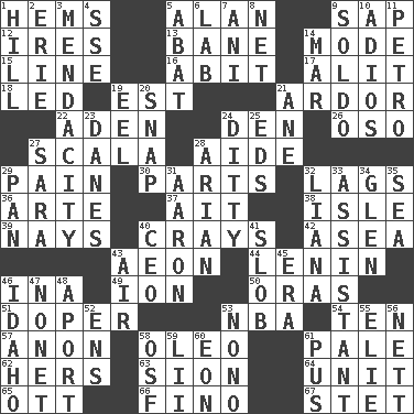 ACROSS 1. Equivocates 5. Actor Alda or Thicke 9. Plant excrement 12. Angers 13. Object of repulsion 14. Method 15. Actor's bit 16. "This won't hurt ____!" 17. Set down 18. Directed 19. Eastern Standard Time (abbr.) 21. Zeal 22. Arabian gulf 24. Lair 26. Bear (Spanish) 27. Any of the three canals of the cochlea 28. Helper 29. Ache 30. Actors' quests 32. Straggles 36. Johnson of "Laugh-In" 37. Small island 38. Capri or Wright 39. Negative votes 40. Trading vessels 42. Toward the sea 43. Period of immesurable duration 44. Soviet premier 1918-24 46. _ tizzy (2 wds.) 49. Electrically charged atom 50. Mouths or openings 51. Drug addict 53. Basketball assoc. 54. "___ Little Indians" 57. At once, immediately (arch.) 58. Butter sub 61. Diluted with white 62. Possessive pronoun 63. The Jewish people; Israel 64. A single undivided whole 65. Baseball player Mel 66. A pale, very dry sherry 67. Proofreading order DOWN 1. Land elevation 2. 4th largest of the Great Lakes 3. Ananias' fault 4. Compass dir. 5. Blind as ____ 6. Experiment locale 7. Black tropical American cuckoo 8. Fish or hair follower 9. Twentieth part of a lira 10. Goodbye (Sp.) 11. Stone: prefix 14. Impair 19. Snakelike fish 20. Fastener 21. One (Scot) 23. Natives or inhabitants of Denmark 24. Simple song 25. Begley and Asner 27. "Two Mules for Sister ____" 28. Believer in; advocate of (suffix) 29. Baking dish 31. Composer Copland 32. Woody, climbing, usually tropical plant 33. Helper 34. Small, secluded valley 35. Ocean 40. Corporate head (abbr.) 41. Oscar Madison type 43. Atmosphere 45. Epoch 46. Potato state 47. Music written for nine 48. To the left, to Queeg 52. Followers of ems 53. Words to Nanette 55. Writer Wiesel 56. Remaining after all deductions 58. Order of Saint Francis (abbr.) 59. Cards in a Roman deck? 60. Age 61. Ichor