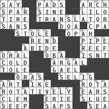 ACROSS 1. Declare 4. Groovy apts. 8. Bowlike part 12. Practice fight 14. Trig term 15. _ and Stitch 16. Hoop that covers a wheel 17. Interpreter 20. Without 21. ___ good deed 22. Numbers guy (abbr.) 23. Fur scarf 27. Brightly colored fish 29. Tear apart 31. Corncob 34. Stay 35. Coral collection 36. Of the mouth 39. Chief or king in Benin or Nigeria 41. Is not 42. Having a low temperature 43. Therefore, facetiously 46. Lacquered or enameled metalware 47. Highlander 48. Mouths or openings 51. Major League Baseball Commissioner Bud 54. Nonscientific branch of learning 56. D.D.E's nickname 58. Round or rotation of duties 61. Rotating or pertaining to rotation 66. Hearing organs 67. To starve (Brit.) 68. 4th largest of the Great Lakes 69. Change direction abruptly 70. Ooze 71. Plant excrements 72. Ocean DOWN 1. Fast planes 2. Capital of Western Samoa 3. Tall tales 4. Pacific Standard Time (abbr.) 5. Wind 6. Heredity factor (abbr.) 7. Post 8. In the manner of 9. Actors Guy, Robert Welles, and Clint 10. Hoof sound 11. Israeli folk dance 13. Relief 18. "Barney Miller" actor Jack 19. Pet locale 24. Globe 25. Flowery wreath 26. Inside; within (prefix) 28. Showery time 30. Debunk (Brit. slang) 32. Fenced enclosure 33. Lizard (obsolete) 34. Tree or shrub in the Birch family 36. Sep. follower 37. Friend of Pooh 38. One to whom something is allotted 40. Ancient river in northeast Turkey 44. Turn to the right 45. 100% 49. Small island 50. What Jean-Claude Killy likes to do 52. Angers 53. Finish lines 54. Arches 55. Hero or heavy, e.g. 57. Nights before holidays 59. Loyal 60. At sea 62. Electrical Unit 63. Period 64. Mouth edge 65. Consenting reply
