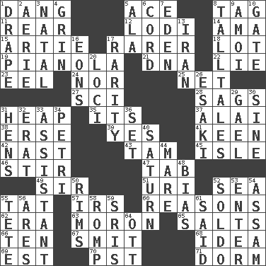ACROSS 1. Mild oath, euphamism for damn 5. Adept person 8. Label 11. Posterior 12. Farming town in central California 14. Nanny (var.) 15. Nick name for Arthur 17. More uncommon 18. Car dealer's back yard 19. Player piano 21. Heredity factor (abbr.) 22. Untruth 23. Snakelike fish 24. Not either 25. Fish or hair follower 27. _-fi 28. Settles 31. Pile 35. ___ a Wonderful Life 37. Jai ____ 38. Celtic language 39. Affirmative reply 41. Peachy ____! 42. Political cartoonist Thomas 43. Scottish cap 45. Small island 46. Disorderly outburst 47. Keyboard key 49. Title for a knight 51. RI univ. 52. Ocean 55. Make lace 57. Big collection agency 60. Thinks logically 62. Epoch 63. Person of subnormal intelligence 65. Table seasonings 66. Nine, plus one 67. Stricken, poetically 68. It may be bright or harebrained 69. Eastern Standard Time (abbr.) 70. Pacific Standard Time (abbr.) 71. Dormintory (informal) DOWN 1. Window treatment 2. Nest on high 3. Relating to or accompanying birth 4. Amused look 5. Insect wing 6. Drawstring 7. Locale of original sin 8. Baron Munchausen's specialties 9. Mine, in Marseilles 10. Yard entry 13. SW Asia republic 16. Immeasurably long periods of time 17. Noteworthy scarcity 20. Venues 26. 1973 Nobel Price Winner (Physics) Leo 29. Highlander 30. Trig term 31. Coop moms 32. Part of Q.E.F. 33. Helper 34. _ dish (used to culture cells) 36. Arrange properly for use 40. Titan orbits this 44. Female horse 48. Prejudice 50. Basketball hoops 52. Twentieth part of a lira 53. Keyboard key 54. Indian state 55. False hair 56. Ancient Greek god of war 58. Play 59. Indian titles of respect 61. Stated 64. Baseball player Mel