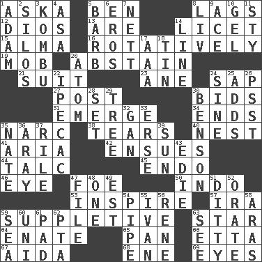 ACROSS 1. "____ silly question..." 5. Benjamin's nick name 8. Falls behind 12. "Vaya con ____" 13. "We ___ not amused" (Victoria) 14. It is permitted: Lat. 15. _ mater 16. Happening in regular succession 19. Crowd into 20. Choose not to consume 21. Set or collection 23. One (Scot) 24. Plant excrement 27. Mail 30. Auction offers 31. Develop 34. Conclusions 35. Drug cop 38. Rends 40. A home for chicks 41. Operatic vocal solo 42. Takes place subsequently 44. Baby powder 45. Inside; within (prefix) 46. Sight organ 47. Enemy 50. _ china 53. Heighten or intensify 57. Retirement account (abbr.) 59. Supplementary 63. Play the lead 64. Maternal 65. Baking dish 66. Singer James 67. Opera by Verdi 68. Compass dir. 69. Sight organs DOWN 1. First of billions? 2. Grain storage towers 3. Dried seaweed eaten as food 4. White ___ sheet 5. Sharp remark 6. Greek god of love 7. Remaining after all deductions 8. 54 in ancient Rome 9. Adept person 10. Set 11. Filthy place 14. Actor's bit 17. Auto club (abbr.) 18. Metal container 20. Smallest unit of an element 22. Medicinal drug used to evoke vomiting 24. Trig term 25. Does sums 26. Inconspicuous attention getter 28. Arrange properly for use 29. Family _ (genealogy) 30. Gillaume's butler role 32. Separate the seeds from cotton 33. Celtic language 35. Nathan's nickname 36. Like ___ of sunshine 37. Cause heat under the collar 39. Player for Phoenix 43. Singer Brickell 47. Do some clerical work 48. Single 49. Eastern Standard Time (abbr.) 51. Simple song 52. Speak pompously 54. Corncob 55. _ the terrible 56. French philosopher Descartes 58. Ancient river in northeast Turkey 59. Ocean 60. Single; one (prefix) 61. Writing tablet 62. Parent Teacher Assoc. 63. Observe