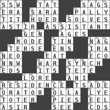 ACROSS 1. Compass dir. 4. Make lace 7. Settles 11. Epoch 12. "Two Mules for Sister ____" 13. Friendly 14. Teat (slang) 15. Became colored 16. Finds the solution 17. Having gotten out of bed 19. Aide 21. Commissioned military rank (abbr.) 23. Grows older 24. Method 25. Shallow baking pan 26. Tired old horse 29. Laconic 30. Followers of ems 31. Retirement account (abbr.) 32. Modern: prefix 33. Consume 34. Environmental prefix 35. Compass dir. 36. Armed conflict 37. Synchronize (abbr.) 40. Begley and Asner 41. ___ a Wonderful Life 42. Wig 43. Old wives' tales, e.g. 45. Cuckoo 46. Home 51. Sadhe (variant) 55. Speaker 56. Spanish pot 58. Potassium hydroxide 59. Carrier 60. Sliced desserts 61. Snakelike fish 62. SW Saudi Arabia district 63. Perceive with the eye 64. Music discs DOWN 1. Bristle 2. Indian titles of respect 3. Electrical Unit 4. The 19th letter of the Greek alphabet 5. Type of rug 6. Small boys 7. Table seasonings 8. Inventor's middle name 9. Small, secluded valley 10. System (abbr.) 12. Tears up 13. Airs 16. Public displays of written messages 18. Russian composer Stravinsky 20. Virtuous person 22. Born 24. Catcalls? 25. Pulls into pieces 26. Sibling's daughter 27. Bowlike part 28. E Mali city 29. Watch over 32. Compass dir. 33. Consumed 36. One who wires 37. R.R. building 38. Gossips 39. Nuclear Threat Initiatives 43. 61 cubic inches 44. Scent 46. Roll call or roster of names 47. Greek god of love 48. Suttee (variant) 49. 911 reaches them 50. Writer Wiesel 52. Actor Baldwin 53. Colored 54. Snakelike fish 57. Area sheltered from the wind