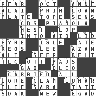 ACROSS 1. Lightbulb-shaped fruit 5. Sep. follower 8. Singer Murray 12. Jai ____ 13. Demure 15. Grant temporary use of 16. Food holder 18. Drink excessively 19. Elected reps. 20. Music discs 22. Player piano 24. Command 26. Trim (branches) 27. To the inside or interior of 28. Help 29. Flaplike covering 32. Jane of fiction 35. Capri or Wright 37. Had dinner 38. Vintage cars 39. Area sheltered from the wind 40. Muslim summons to prayer 41. The first octave above the treble staff 42. Ooze 43. Waist strap 44. Affectionate concern, for short 45. Baseball player Mel 46. Writing tablets 49. E Mali city 50. Margarine 51. Borne 55. Everything 56. Old wives' tales, e.g. 57. Dollar (slang) 59. Type of eclipse 63. Writer Wiesel 64. "Two Mules for Sister ____" 65. Jacques of French films 66. Neighbor of Neb. 67. ___ Haven, CT 68. Mild oath DOWN 1. Infant food 2. Pipe bend 3. Auto club (abbr.) 4. Actors Guy, Robert Welles, and Clint 5. Choose 6. Riding implement 7. Native american tent (variation) 8. Columnist Joseph or Stewart 9. Christmas carol 10. Grandmother 11. Followers of ems 14. Ear of corn 17. Paradise 21. Fast jet (abbr.) 23. Lower and raise head in agreement 25. Rest room 28. City in Syria 29. Goldbrick 30. Slanted text style (abbr.) 31. Incision 32. Part of Q.E.F. 33. Shout 34. College mil. group 36. Observe 40. Utter; complete 42. Unemotional ones 45. Boat paddle 47. Chicken ___ king 48. Small valley 49. Of Greece 51. Lacking warmth 52. Operatic vocal solo 53. Enthusiasm 54. Have the gumption 56. French article 58. Informal term for the mouth 60. Tired old horse 61. "One Day ___ Time" 62. To free from
