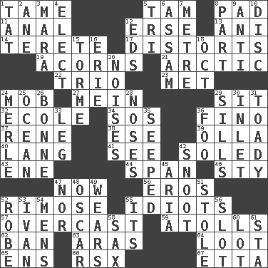 ACROSS 1. Docile 5. Scottish cap 8. Groovy apt. 11. Of or related to the anus 12. Celtic language 13. Black tropical American cuckoo 14. Cylindrical with tapered ends 17. What propaganda does 19. Oak nuts 21. Northern region 22. Musical group of three 23. Was introduced to 24. Disorderly crowd 27. Chow _ 29. Be seated 32. Learning spot: Fr. 34. Mayday 36. A pale, very dry sherry 37. French philosopher Descartes 38. Compass dir. 39. Rounded earthenware pot or jar 40. Austrian-born American filmmaker Fritz 41. Perceive with the eye 42. Having a sole or soles 43. Compass dir. 44. Connect, as a bridge 46. Filthy place 47. Immediately 50. Greek god of love 52. Full of chinks, cracks, or crevices 55. Foolish or stupid persons 57. Cloudy 59. Ringlike coral islands and reefs 62. Bar 63. Caspian sea tributary 64. Plunder 65. Followers of ems 66. Acura sports coupe 67. Singer James DOWN 1. Make lace 2. A saturated hydrocarbon 3. Hindu Mythology: god of death 4. Opt 5. Three (prefix) 6. Indian state 7. Distance measurement (Brit.) 8. Piece 9. Opposed to 10. Flat circle 12. Begley and Asner 15. Singer Mel 16. 4th largest of the Great Lakes 18. Sep. follower 20. Annoying sounds 24. Haggard of country music 25. Sea 26. Maid-servant 28. Olfactory organs 29. Beverly of Met fame 30. An arm off of a larger body of water 31. Sycophant 33. Part of a journey 35. Oozed 36. Egg _ yung 42. Snout, nose 45. Operatic vocal solo 47. Or not 48. Witty Wilde 49. Erodes 51. Fur scarf 52. Loose flowing garment 53. _ the terrible 54. Not women's 55. It is 56. Slit 58. Saxophone 60. Car dealer's back yard 61. R.R. building