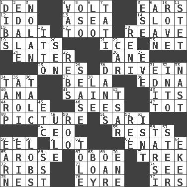 ACROSS 1. Lair 4. Electrical Unit 8. Hearing organs 12. Wedding promise 13. Toward the sea 14. Groove 15. Indonesian resort city 17. A blast of a horn 18. Rob, plunder, or pillage 19. Narrow boards 21. Frozen water 23. Fish or hair follower 24. Keyboard key 26. A saturated hydrocarbon 28. Singles 30. Popular '50s hangout 34. Make lace 37. Actor Lugosi 39. Pulitzer Prize-winning author Ferber 40. Housemaid (var.) 41. Virtuous person 43. It is 44. Hero or heavy, e.g. 46. Observes 47. Small child 48. Photo 51. Indian skirt 54. Corporate head (abbr.) 55. Musical pauses 58. Snakelike fish 61. Car dealer's back yard 63. Maternal 65. Came up 67. Mitch Miller's instrument 71. Long journey 72. Teases 73. Grant temporary use of 74. Observe 75. Egg locale 76. Jane of fiction 77. Big collection agency DOWN 1. Rights 2. Peak District village in England 3. Pitcher Ryan 4. Large container 5. Bear (Spanish) 6. Lion 7. Jacques of French films 8. Compass dir. 9. Actor Alda or Thicke 10. Be footloose 11. Proofreading order 16. "Tell ____ the Marines!" 18. Painter Guido (1575-1642) 20. Elected rep. 22. Automobile 25. Confederate soldiers (slang) 27. Night before a holiday 29. Gospel singer Marvin 30. Natives or inhabitants of Denmark 31. Prepare for publication 32. To the inside or interior of 33. Political cartoonist Thomas 34. Canvas cover 35. Mine, in Marseilles 36. Baby powder 38. Falsehood 42. Russian ruler of old 45. And so on (abbr.) 49. Ubangi River tributary 50. Friend of Pooh 52. To separate or throw off 53. Is not 56. Tarsus (plural) 57. Bull 58. Merit 59. One of the Great Lakes 60. Tennis shots 62. Lacquered or enameled metalware 64. Makes supply last 66. Fast jet (abbr.) 68. Male child 69. Boat paddle 70. Compass dir.