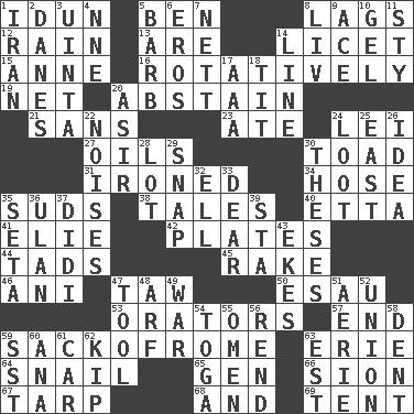 ACROSS 1. Goddess of spring and wife of Bragi 5. Benjamin's nick name 8. Fails to keep up a pace 12. Water falling in drops from the sky 13. "We ___ not amused" (Victoria) 14. It is permitted: Lat. 15. Queen of England 1702-14 16. Producing rotation 19. Fish or hair follower 20. Choose not to consume 21. Without 23. Had dinner 24. Flowery wreath 27. Petroleums 30. Frog relative 31. Pressed 34. Stockings 35. Soap bubbles 38. Falsehoods 40. Singer James 41. Writer Wiesel 42. Food holders 44. Small amounts or degrees 45. Libertine 46. Black tropical American cuckoo 47. The 23rd letter of the Hebrew alphabet 50. Son of Isaac 53. Speakers 57. Conclusion 59. Italian handbag shop? 63. 4th largest of the Great Lakes 64. Slow-paced one 65. Commissioned mil. rank 66. The Jewish people; Israel 67. Canvas cover 68. Added to 69. Portable shelter DOWN 1. SW Asia republic 2. Natives or inhabitants of Denmark 3. National forest in Provo, Utah 4. Compass dir. 5. Sharp remark 6. Greek god of love 7. Remaining after all deductions 8. 54 in ancient Rome 9. Adept person 10. Set 11. Filthy place 14. Actor's bit 17. American Automobile Association (abbr.) 18. Teat (slang) 20. SW Saudi Arabia district 22. Annoying sounds 24. Spoils 25. Compass direction 26. The main thing one is thinking about 28. Car dealer's back yard 29. Fastener 30. College papers 32. Pipe bend 33. Letter starter 35. Bristle 36. Uhlan (variant) 37. "You Light Up My Life" star Conn 39. R.R. building 43. Supplements with great effort 47. Instrument 48. Sandy's bark 49. Armed conflict 51. Nest on high 52. The state of being joined or united 54. Ancient Roman robe 55. Presage 56. Tear apart 58. Gouge 59. Fast jet (abbr.) 60. Santa ___, CA 61. Auto 62. Monetary unit of Laos 63. Eastern Standard Time (abbr.)