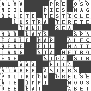 ACROSS 1. _ mater 5. Before (prefix) 8. Bear (Spanish) 11. Famous astronaut Armstrong 12. Sliced desserts 13. Tired old horse 14. Keyboard key 17. A testis 19. A period of five years 21. Cigar-shaped 22. Hyperbolic tangent 23. Ocean 24. Disorderly crowd 27. 24-hour periods 29. Health resort 32. Learning spot: Fr. 34. Atlas unit 36. Actor Baldwin 37. French philosopher Descartes 38. Pipe bend 39. Electrical Unit 40. Long (Scottish) 41. R.R. building 42. Paris' subway 43. Compass dir. 44. Portico 46. Title for a knight 47. American Automobile Association (abbr.) 50. Singer James 52. A viewer who gazes fixedly 55. Michaelmas daisies 57. Coward 59. Threatening words 62. Had dinner 63. Body of Kaffir warriors 64. Good sense 65. To riddle 66. Consume 67. Collude with DOWN 1. Also 2. Area sheltered from the wind 3. Place where flour is made 4. Native American of Southwest Alaska 5. Sliced dessert 6. Musical pauses 7. First name in cosmetics 8. At one time in the past 9. Table seasoning 10. Double curve, resembling the letter S 12. Parent Teacher Association (abbr.) 15. Sadhe (variant) 16. Inactive volcano in Sicily 18. Retirement account (abbr.) 20. Poems 24. Haggard of country music 25. Sea 26. Maid-servant 28. Table seasonings 29. Narrow boards 30. _ dish (used to culture cells) 31. Thespian 33. Part of a journey 35. Food holders 36. Deep reverence 42. Mother 45. Von Bismarck 47. Tate display 48. Nest on high 49. Scent 51. Sports stadium 52. Practice fight 53. Carry 54. Toward shelter 55. Cuckoo 56. Messy guy 58. Choose 60. Institute legal proceedings 61. Eastern Standard Time (abbr.)