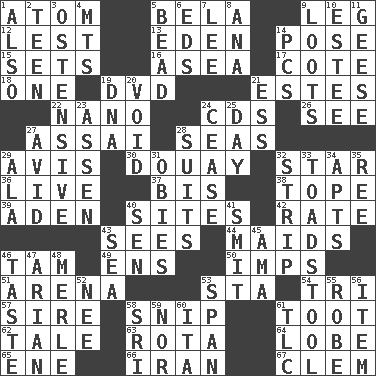 ACROSS 1. Smallest unit of an element 5. Actor Lugosi 9. Part of a journey 12. For fear that 13. Genesis locale 14. Airs 15. Puts into a specified state 16. Toward the sea 17. ____ d'Azur (French Riviera) 18. Single 19. Movie disc 21. _____ Park, CO 22. Billionth: prefix 24. Music discs 26. Perceive with the eye 27. Slender Brazilian palm 28. Oceans 29. Deliberation 30. A city in N France, SE of Calais 32. Play the lead 36. Not recorded 37. Twice 38. Drink excessively 39. Arabian gulf 40. Settings 42. Pace 43. Observes 44. Unmarried girls 46. Scottish cap 49. Followers of ems 50. Naughty children 51. Sports stadium 53. R.R. building 54. Three (prefix) 57. Title for a man of rank and authority 58. Sever or remove by pinching or nipping 61. A blast of a horn 62. Lie 63. Round or rotation of duties 64. Ear part 65. Compass dir. 66. SW Asia republic 67. To starve (Brit.) DOWN 1. In addition 2. Adolescent 3. Clearly or manifestly demonstrative 4. Mountains (abbr.) 5. Necklace unit 6. Begley and Asner 7. Area sheltered from the wind 8. Santa ___, CA 9. Plunders 10. First name in cosmetics 11. Honkers 14. Personal Computers (abbr.) 19. Heredity factor (abbr.) 20. Lacking any legal or binding force 21. Curvy letter 23. NE Netherlands city 24. Stop 25. 24 hours 27. Enthusiastic 28. Sets of matching outer garments 29. Insect wing 31. Off-Broadway awards 32. Remove all contents or possession from 33. Inedible or poisonous agaric 34. Tenement units (abbr.) 35. To separate or throw off 40. Elected rep. 41. Stricken, poetically 43. Ocean 45. Nursemaid (var.) 46. Clothes sense 47. Believer in; advocate of (suffix) 48. Haggard of country music 52. Born 53. Connect, as a bridge 55. Loose flowing garment 56. Detail 58. Indian title of respect (Mr.) 59. Or not 60. Call ___ day 61. Affectionate concern, for short