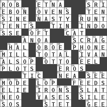 ACROSS 1. Director Reiner 4. Inactive volcano in Sicily 8. _ Lanka 11. Inky black, to poets 13. Baking chambers 15. Nine, plus one 16. Trig term 17. Characterized by obscenity 18. Undersized animal 19. Portable shelters 21. Shallow baking pan 22. Southeast Asian peninsula 23. Compass dir. 24. Often (poetically) 27. Domesticated feline 29. Small Philippine buffalo 30. Lean end of the neck 34. Actor Linden 36. Mitch Miller's instrument 39. Give a jingle 40. Place where flour is made 41. Add up to 43. _ the terrible 44. Columnist Joseph or Stewart 46. Von Bismarck 47. Snakelike fish 48. Small pieces of grounds 49. Greek god of love 51. Nervous spasm 53. Teachers' org. 54. Perceive with the eye 57. Method 60. Trim (branches) 63. Gives food to 65. Writer Wiesel 66. Metal shackles 69. Narrow board 70. Modern: prefix 71. Flower holders 72. Filth; sediment 73. Mayday 74. Proofreading order 75. Turn to the right DOWN 1. Musical pauses 2. Off-Broadway awards 3. Child's nurse 4. Age 5. Federal power corp. 6. A home for chicks 7. Opposed to 8. Surprise greatly 9. Tear apart 10. To the inside or interior of 12. Fish or hair follower 14. Synchronize (abbr.) 18. Actors Guy, Robert Welles, and Clint 20. Male child 25. 12 inches 26. Off limits 28. Cleo's killer 29. One to whom something is allotted 31. Be footloose 32. Of or related to the anus 33. Commissioned military rank (abbr.) 34. Land elevation 35. In addition 37. Baseball player Mel 38. Ingested 40. Atlas unit 42. Old wives' tales, e.g. 45. Air pressure measure (abbr.) 50. Clumsy lout 52. 154 in Roman numerals 54. Former Milwaukee Brewers owner Bud 55. Peak District village in England 56. First name in cosmetics 57. Not women's 58. Butter sub 59. "Vaya con ____" 61. Mouths or openings 62. Mail 64. Double-curved letter 67. Born 68. Fast jet (abbr.)