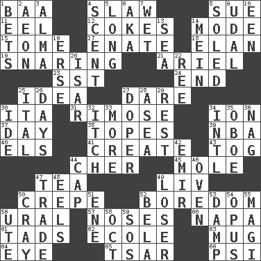 ACROSS 1. Sound made by sheep 4. Cole _ (cabbage dish) 8. Institute legal proceedings 11. Snakelike fish 12. Popular sodas 14. Method 15. Heavy book 17. Maternal 18. Style 19. Catching in a trap 21. Satellite of Uranus 23. Fast jet (abbr.) 24. Conclude 25. It may be bright or harebrained 27. Have the gumption 30. Call ___ day 31. Full of chinks, cracks, or crevices 34. Electrically charged atom 37. 24 hours 38. Drinks excessively 39. Basketball assoc. 40. Raised railways 41. Make 43. Coat; cloak 44. "Mermaids" star 45. Undercover agent 47. Afternoon social gathering 49. 54 in ancient Rome 50. Streamer paper 52. Mood resulting from idleness 56. Mountain range 57. Olfactory organs 60. California wine valley 61. Small amounts or degrees 62. Learning spot: Fr. 63. Large cup 64. Sight organ 65. Russian ruler of old 66. 23rd letter of the Greek alphabet DOWN 1. Stakes 2. A really long time 3. _ mater 4. Odor 5. Protracted 6. Alias (abbr.) 7. Soggy 8. Having a sole or soles 9. Hereditary estate 10. Car or cant ending 13. Ocean 14. Chow _ 16. Celtic language 20. Austrian river, tributary to the Danube 22. To sift 25. Slanted text style (abbr.) 26. 24-hour periods 27. Drug addict 28. At sea 29. Relief 30. Binary compound 32. Hankering 33. Greater amount 34. International (abbr.) 35. Mitch Miller's instrument 36. Tired old horse 42. Independent ruler or chieftain 44. Head covering 46. Baking chamber 47. Barter 48. Snakelike fish 49. Failure 50. Supercomputer manufacturer 51. Compass dir. 52. Actor Lugosi 53. Moist 54. Musical composition 55. Wise men 56. Shoshoni 58. Sep. follower 59. Mayday