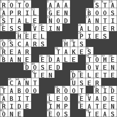 ACROSS 1. Printing process, for short 5. American Automobile Association (abbr.) 8. R.R. building 11. Showery time 13. Commissioned military rank (abbr.) 14. Expressions of contempt or scorn 15. Showing deterioration from age 16. Dreamland 17. Against 18. Double-curved letter 19. Distinctive style or manner 21. Tree or shrub in the Birch family 22. The bottom of a shoe or boot 24. Sliced desserts 25. Motion picture awards 27. Part of HMS, perhaps 29. Posterior 30. Receives possession of 32. Object of repulsion 33. Peak District village in England 35. Heavy book 39. Administered medicine 41. Baking chamber 42. Nine, plus one 43. Keyboard key 45. Patter 48. One who uses or employs something 49. Off limits 50. Carrot, for example 52. To free from 55. "This won't hurt ____!" 56. Lion 57. Elude 59. Travel on an animal 60. Naughty child 61. Eroded 62. Single 63. Greek goddess of the dawn 64. Afternoon social gatherings DOWN 1. Raze (variant) 2. Elects 3. File 13 4. Petroleum 5. Hindu god of fire 6. A really long time 7. Plus 8. Something which is sent 9. Lugs 10. SW Saudi Arabia district 12. Crowbar 14. Indonesian resort city 20. Raised railways 21. Domed church section 23. Having ears or earlike features 25. Globe 26. Ocean 27. Actor Linden 28. Mamie's husband 30. Small amount or degree 31. Took without asking 33. Compass dir. 34. Lair 36. Make much ado about nothing 37. Was introduced to 38. Compass dir. 40. "Beetle Bailey" pooch 43. Superhero pair 44. First name in cosmetics 45. Small house or cottage 46. Tolerate 47. Musical sound 49. Pacific island yam 50. San ____ (Riviera town) 51. I made a mistake 53. The main thing one is thinking about 54. Hiding places for outlaws 56. Untruth 58. Large container