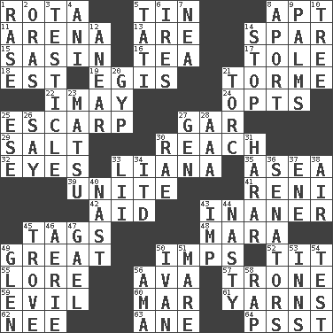 ACROSS 1. Round or rotation of duties 5. Metal container 8. Fitting 11. Sports stadium 13. "We ___ not amused" (Victoria) 14. Coast Guard woman 15. Indian antelope 16. Afternoon social gathering 17. Lacquered or enameled metalware 18. Eastern Standard Time (abbr.) 19. The front part of a cuirass 21. Singer Mel 22. "If ____ say so..." 24. Elects 25. Fortification 27. Slender fish 29. Table seasoning 30. Arrive at 32. Snake ____ (dice throw) 33. Climbing, woody, usually tropical vines 35. Toward the sea 39. Join together 41. Painter Guido (1575-1642) 42. Help 43. Sillier 45. Labels 48. Hindu Mythology: god of death 49. Relatively large 50. Naughty children 52. Teat (slang) 55. Old wives' tales, e.g. 56. Actress Gardner 57. Heavy duty weighing machine 59. Tending to cause great harm 60. Spoil 61. Tall tales 62. Born 63. One (Scot) 64. Inconspicuous attention getter DOWN 1. Raze (variant) 2. Mouths or openings 3. One of the two male reproductive glands 4. Cuckoo 5. Jacques of French films 6. Angers 7. Teachers' org. 8. To the left, to Queeg 9. Insides of hands 10. Woody plant 12. Approach 14. Close up, plug up 20. Con 21. Torque (variant) 23. Taiwanese island in East China Sea 25. Compass dir. 26. Declare 27. Commissioned mil. rank 28. Auto club (abbr.) 30. Actress Charlotte 31. Ethiopian city, capital of Harari 33. Cards in a Roman deck? 34. It would 36. Legislators 37. Compass dir. 38. Wind 40. Political cartoonist Thomas 43. Naughty child 44. Thoroughly unpleasant 45. Collection of objects 46. Nest on high 47. Highlander 49. Small, secluded valley 50. "Terrible" tsar 51. Female horse 53. Lodging establishments 54. Trial 56. Nanny (var.) 58. Reproach for some lapse or misdeed