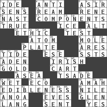 ACROSS 1. Binary compound 4. Opposed to 8. SW Saudi Arabia district 12. Elected reps. 14. 480, 500 or 516 sheets of paper 15. French philosopher Descartes 16. Political cartoonist Thomas 17. Parts 20. Loyal 21. Frozen water 22. The first octave above the treble staff 23. Principle of right and wrong 27. Trial 29. Smallest unit of an element 31. Undercover agent 34. Food holder 35. Ancient Greek god of war 36. Periodic rise and fall of the sea level 39. Compass dir. 41. Fast planes 42. Arabian gulf 43. From or relating to Ireland 46. Aureate 47. Haul 48. At sea 51. Sadhe (variant) 54. Dripping 56. Environmental prefix 58. Housemaid 61. The property of being fit to eat 66. "Death on the ____" 67. Small Philippine buffalo 68. Nights before holidays 69. Small, secluded valley 70. Long (Scottish) 71. Posted 72. It is so DOWN 1. Is not 2. Letter starter 3. Take place subsequently 4. Curve 5. Modern: prefix 6. Scottish cap 7. Body of Kaffir warriors 8. "We ___ not amused" (Victoria) 9. Elected representatives 10. International (abbr.) 11. Relief 13. Proofreading order 18. Sep. follower 19. Born 24. Actor Linden 25. Call ___ day 26. ____ d'Azur (French Riviera) 28. Box-office sellout 30. Mesonic 32. Allow 33. Double-curved letter 34. Hangs 36. Label 37. Wedding promise 38. Accusation by an informer 40. Part of Q.E.F. 44. Big collection agency 45. R.R. building 49. Snakelike fish 50. Adept person 52. Mild oath, euphamism for damn 53. Poet Dickinson 54. Welt 55. Pulitzer Prize-winning author Ferber 57. Singles 59. Toward shelter 60. Coop moms 62. Paper or plastic container 63. First lady 64. Elected rep. 65. Fast jet (abbr.)