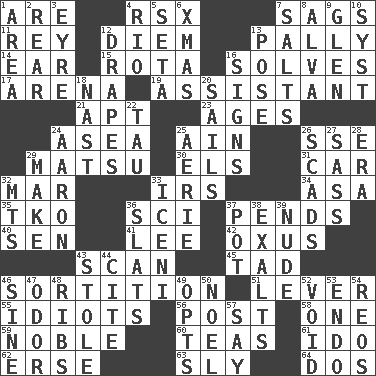 ACROSS 1. "We ___ not amused" (Victoria) 4. Acura sports coupe 7. Droops 11. Marina Del _, California 12. South Vietnam president (1954) 13. Chummy 14. Ewer handle 15. Round or rotation of duties 16. Finds the solution 17. Sports stadium 19. Aide 21. Fitting 23. Eras 24. At sea 25. The 18th letter of the Arabic alphabet 26. Compass dir. 29. Taiwanese island in East China Sea 30. Raised railways 31. 4-wheeled motor vehicle 32. Impair 33. Big collection agency 34. White ___ sheet 35. Ring climax 36. _-fi 37. Depends 40. Elected rep. 41. Area sheltered from the wind 42. The longest river in Central Asia 43. Examine hastily 45. Small boy 46. Determination 51. Crowbar 55. Foolish or stupid persons 56. Mail 58. Single 59. Impressive in appearance 60. Beverages made from leaves 61. Wedding promise 62. Celtic language 63. Insidious 64. Two (Sp.) DOWN 1. Length times width 2. Hitchcock's "____ Window" 3. Jane of fiction 4. River (Sp.) 5. Stalk of a moss capsule 6. Dec. holiday 7. Table seasonings 8. Inventor's middle name 9. Small, secluded valley 10. System (abbr.) 12. Window treatments 13. Airs 16. Omens 18. Political cartoonist Thomas 20. Travel by water 22. The 19th letter of the Greek alphabet 24. Composer Copland 25. Nest on high 26. Tons 27. Backtalk 28. Epoch 29. Create 32. Mountains (abbr.) 33. Ancient Celtic tribe of eastern Britain 36. Narrow boards 37. Cooking vessel 38. Honors 39. Naked 43. Took without asking 44. Quote 46. Trig term 47. Scent 48. Chest bones 49. Elects 50. Christmas carol 52. Empty area or space 53. Inside; within (prefix) 54. Vintage cars 57. Declare