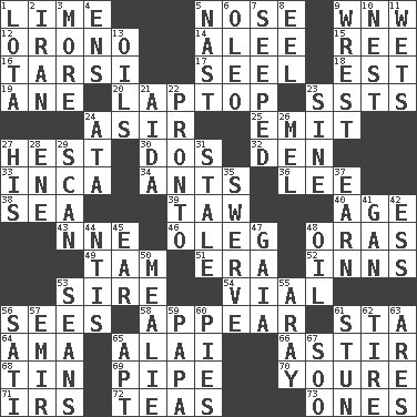 ACROSS 1. Welles in "The Third Man" 5. Sense of smell 9. Compass dir. 12. U. of Maine site 14. Toward shelter 15. To sift 16. Tarsus (plural) 17. Sew up the eyelids of hawks and falcons 18. Eastern Standard Time (abbr.) 19. A saturated hydrocarbon 20. Portable computer 23. Fast planes 24. SW Saudi Arabia district 25. Send forth 27. Command 30. Two (Sp.) 32. Lair 33. South American Indian 34. Pismires 36. Area sheltered from the wind 38. Ocean 39. The 23rd letter of the Hebrew alphabet 40. Ripen 43. Compass dir. 46. Cassini of fashion 48. Mouths or openings 49. Scottish cap 51. Epoch 52. Lodging establishments 53. Father 54. Small bottle 56. Observes 58. Seem 61. R.R. building 64. Nanny (var.) 65. Mountain range southwest of Kyrgyzstan 66. Being in motion 68. Shallow baking pan 69. Corncob 70. You are 71. Big collection agency 72. Beverages made from leaves 73. Washington bills DOWN 1. Globular water bottle used in Asia 2. SW Asia republic 3. Greater amount 4. Followers of ems 5. Political cartoonist Thomas 6. Butter sub 7. Oozed 8. Snakelike fish 9. Take or capture by force 10. Egg locale 11. Soaks 13. Lubricates 21. Opera by Verdi 22. Right away 23. Trig term 24. "One Day ___ Time" 26. Cartoonist voice _ Blanc 27. Part of HMS, perhaps 28. Compass dir. 29. Examine hastily 31. Showing deterioration from age 35. Turn aside suddenly 37. Merit 41. Separate the seeds from cotton 42. Curvy letter 44. Nuclear Threat Initiatives 45. Ewer handle 47. Greek goddess of the earth (variant) 48. Lubricate 50. Ear of corn 53. Seines 55. Like ___ of sunshine 56. Suttee (variant) 57. Independent ruler or chieftain 59. Dad 60. Sliced desserts 61. Make senseless or dizzy 62. Become fatigued 63. Ancient Greek god of war 65. Fitting 67. "Barney Miller" actor Jack