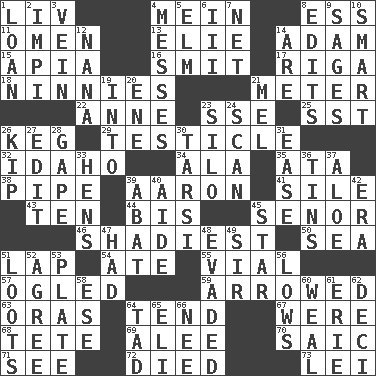 ACROSS 1. 54 in ancient Rome 4. Count _ (2 wds.) 8. Curvy letter 11. Presage 13. Writer Wiesel 14. First of billions? 15. Capital of Western Samoa 16. Stricken, poetically 17. Capital of Latvia 18. Simpletons 21. Distance measurement 22. Singer Murray 23. Compass dir. 25. Fast jet (abbr.) 26. Cask 29. A testis 32. Potato state 34. According to 35. _ moment's notice (2 wds.) 38. Corncob 39. Composer Copland 41. Drop; flow; fall 43. "___ Little Indians" 44. Twice 45. Sir (Sp.) 46. Most dark, concealed or hidden 50. Ocean 51. Pet locale 54. Had dinner 55. Small bottle 57. Stared 59. Moved like an arrow 63. Mouths or openings 64. Watch over 67. Past tense of be (plural) 68. False hair 69. Toward shelter 70. Ketch in the Levant 71. Perceive with the eye 72. Passed on 73. Flowery wreath DOWN 1. Grant temporary use of 2. Body of Kaffir warriors 3. Distinctive style or manner 4. Makes clutter 5. Shade tree 6. One more than two 7. Fish or hair follower 8. Prepares for publication 9. Gurus 10. Don Adams' spy role 12. Grandmother 14. "We ___ not amused" (Victoria) 19. To the inside or interior of 20. Compass dir. 21. Cartoonist voice _ Blanc 23. Grain storage tower 24. Examine hastily 26. Sleep 27. Prepare for publication 28. Yawn 30. Tarsus (plural) 31. Comfort 33. Coop moms 36. Airtight sealed metal containers 37. _ vera 39. Blind as ____ 40. Assistant 42. Period 45. Play the lead 47. Possessed 48. Eluded 49. Title for a knight 51. Plunders 52. Match 53. Food holder 56. Coldest temperatures 58. Compass dir. 60. Welt 61. One of the Great Lakes 62. Tenth: prefix 64. Small boy 65. Biblical high priest 66. Born