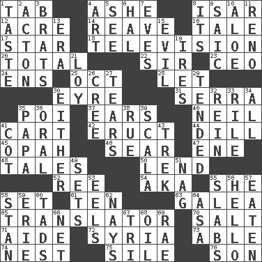 ACROSS 1. Keyboard key 4. American tennis player Robert 8. Austrian river, tributary to the Danube 12. 1/640 square mile 14. Rob, plunder, or pillage 16. Story 17. Play the lead 18. Household entertainment appliance 20. Add up to 22. Title for a knight 23. Corporate head (abbr.) 24. Followers of ems 25. Sep. follower 28. Allow 30. Jane of fiction 31. Spanish missionary in California 35. Luau course 37. Hearing organs 40. Famous astronaut Armstrong 41. Haul 42. Spew [out] 44. Deli pickle 45. Brightly colored fish 46. Shrivel 47. Compass dir. 48. Lies 50. Grant temporary use of 52. To sift 54. Alias (abbr.) 55. A female animal or person 58. Arrange properly for use 61. Nine, plus one 63. An organ shaped like a helmet 65. Interpreter 70. Table seasoning 71. Helper 72. Damascus' land 73. Competent 74. A home for chicks 75. Drop; flow; fall 76. Male offspring DOWN 1. Clothes sense 2. 13-14th century defensive garment 3. Naughty children 4. Nonscientific branch of learning 5. Perceive with the eye 6. Actor Linden 7. Nights before holidays 8. It is 9. Ketch in the Levant 10. _ vera 11. Western Nevada city 13. Epoch 15. Morally bad or wrong 19. Angers 21. Myrna of the movies 26. Algonquian 27. Lacerates 29. Watched over 30. One or the other 32. It's straight from the horse's mouth 33. Cause heat under the collar 34. Everything 35. Dad 36. Spoken 38. Regret 39. Any of the three canals of the cochlea 41. Small bed 43. Long journey 49. Puts into a specified state 51. Tired old horse 53. Snakelike fish 55. Broad, flat, thick pieces 56. Phone greeting 57. Eroded 58. Comedian Laurel of Laurel & Hardy 59. One of the Great Lakes 60. Small amounts or degrees 62. Negative votes 64. White ___ sheet 66. Fish or hair follower 67. Three (prefix) 68. Lubricate 69. Actress Charlotte