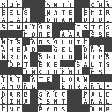ACROSS 1. Institute legal proceedings 4. Stricken, poetically 8. Mouth or opening 11. Snakelike fish 13. Nathan's nickname 14. Independent ruler or chieftain 15. Mountain range southwest of Kyrgyzstan 16. Northwest Algerian city 17. "You Light Up My Life" star Conn 18. Elected representative 21. _____ Park, CO 22. Greater amount 23. Auto club (abbr.) 25. Compass dir. 26. Mountains (abbr.) 29. Utter; complete 32. Forward in time 34. Set 35. Heredity factor (abbr.) 38. Songbird 39. Having a sole or soles 41. Cuts off 43. Elect 44. Make supply last 45. Table seasonings 46. Happening 50. Eastern Standard Time (abbr.) 51. Make lace 54. Had dinner 55. Grant temporary use of 57. Amid 59. The state or an instance of erring 63. Sharp remark 64. Ketch in the Levant 67. Light colored 68. Pale green bean 69. Is not 70. Of or related to the anus 71. Compass dir. 72. Writing tablets 73. Electrical Unit DOWN 1. Oceans 2. Ubangi River tributary 3. Style 4. Sounds asleep 5. Make imperfect 6. Call ___ day 7. "___ Little Indians" 8. Leaves out 9. Amusement-park features 10. Originate 12. Thailand, formerly 14. Begley and Asner 19. Frog relative 20. Globe 21. Erode 23. Toward shelter 24. Old (Scot.) 26. Opening into something insatiable 27. Through, poetically 28. Ooze 30. Stared at amorously 31. Pulitzer Prize-winning author Ferber 33. Opposed to 36. "Death on the ____" 37. Tenement units (abbr.) 39. Religious group 40. Migrant worker of the '30s 42. Fast jet (abbr.) 45. Play the lead 47. Tired old horse 48. Opts 49. Not either 51. Eating place 52. With great haste 53. Singer Mel 56. California wine valley 58. Basketball assoc. 60. Grandmother 61. Dollar (slang) 62. Sharp bark 64. Small drink 65. White ___ sheet 66. Working for oneself (abbr.)
