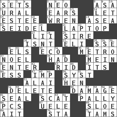 ACROSS 1. Puts into a specified state 5. Modern: prefix 8. White ___ sheet 11. Mountain range 12. Hearing organs 14. Allow 15. First name in cosmetics 17. Songbird 18. Toward the sea 19. Beer mug 21. Portable computer 23. Cards in a Roman deck? 25. Father 26. Is not 27. Connecticut Ivy Leaguer 28. Compass dir. 31. Raised railways 33. Environmental prefix 35. Paris' subway 37. Christmas carol 38. Possessed 40. Chow _ 41. Keyboard key 43. To free from 45. It is 46. Double-curved letter 47. Naughty child 50. System (abbr.) 52. Jai _ 53. Layer 54. Keyboard key 56. Break 61. Lick closed 62. Leave at once 65. Chummy 66. Personal Computers (abbr.) 67. Ubangi River tributary 68. _ gin 69. Small island 70. R.R. building 71. Scottish caps DOWN 1. Takes to court 2. Celtic language 3. Jacques of French films 4. Downhill vehicle 5. ___ Haven, CT 6. Ewer handle 7. Threatening words 8. In addition 9. Ooze 10. _ moment's notice (2 wds.) 13. Slow-paced one 16. Snakelike fish 18. Had dinner 20. Actor's bit 22. Demure 24. Hankering 26. Capri or Wright 28. Proofreading order 29. Indian titles of respect 30. Period of immesurable duration 31. Immeasurably long periods of time 32. Allows 34. Rowing implement 36. Send forth 37. Born 39. Food container 42. Cause heat under the collar 44. Colored 48. Taiwanese island in East China Sea 49. Components 51. Fastener 52. 100% 54. Tenth: prefix 55. Compass direction 57. Vertical spar for supporting sails 58. Silent film actress Nazimova 59. Take by theft 60. Sight organs 61. Health resort 63. Keyboard modifier key 64. Beverage made from leaves