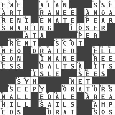 ACROSS 1. She-sheep 4. ____ Jay Lerner 8. Compass dir. 11. Tate display 12. Indian princess (variant) 14. Small Philippine buffalo 15. Painter Guido (1575-1642) 17. Maternal 18. Lightbulb-shaped fruit 19. Catching in a trap 21. Failure 23. "One Day ___ Time" 24. For each 25. Monthly bill 27. Native of Scotland 30. Modern: prefix 31. Spoke pompously 34. Pipe bend 37. A really long time 38. Lacking in sense or substance 39. To riddle 40. Double-curved letter 41. Greek mezzo-soprano Agnes 43. It is 44. Capri or Wright 45. Perceives with the eye 47. Symbol (abbr.) 49. Soggy 50. Not well drained, as in land 52. Speakers 56. Promenade 57. Peak District village in England 60. Type of rug 61. Place where flour is made 62. Moves on water 63. Electrical Unit 64. Begley and Asner 65. Naughty child 66. Distress signal DOWN 1. Hearing organs 2. Songbird 3. Inactive volcano in Sicily 4. Sports stadium 5. Long (Scottish) 6. Santa ___, CA 7. Fish or hair follower 8. Scornful expression 9. Fly high 10. Hearing organ 13. Snakelike fish 14. Domed church section 16. SW Asia republic 20. "Tell ____ the Marines!" 22. Elect 25. Vintage cars 26. Immeasurably long periods of time 27. Having lost freshness 28. Penny 29. Lyric poems 30. Born 32. Chest bones 33. Of or related to the anus 34. One of the Great Lakes 35. Allows 36. French article 42. At sea 44. Naughty child 46. Singer James 47. Exchanges for money 48. Shout 49. Take or capture by force 50. Stated 51. It is so 52. Spanish pot 53. Mouths or openings 54. San ____ (Riviera town) 55. Plant excrements 56. Madame (abbr.) 58. Apply (a substance) by light strokes 59. Wind