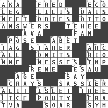 ACROSS 1. Alias (abbr.) 4. Flintstone 8. Environmental prefix 11. Part of a journey 12. Ms. Damita and namesakes 14. Raised platform 15. Rendezvous 17. Off-Broadway awards 18. Von Bismarck 19. Replies (to) 21. Giggle 23. Actress Gardner 24. Avid follower 25. Airs 27. Collude with 30. Label 31. A viewer who gazes fixedly 34. Curve 37. 100% 38. Leaves out 39. _ de Janeiro 40. Madame (abbr.) 41. Makes clutter 43. Naughty child 44. French philosopher Descartes 45. Son of Isaac 47. Ripen 49. Declare 50. Trading vessels 52. More disrespectful 56. Set down 57. Small island 60. Relationship diagram 61. Louse (plural) 62. Inclined to pout 63. Period 64. Federal power corp. 65. Fly high 66. Symbol (abbr.) DOWN 1. _ mater 2. Peachy ____! 3. Ripens 4. Plants 5. Chest bones 6. Biblical high priest 7. Pass on 8. Consumed 9. Quote 10. Bear (Spanish) 13. Fast jet (abbr.) 14. Capital of the state of Qatar 16. It was, poetically 20. Nights before holidays 22. Lizard (obsolete) 25. Inside of hand 26. Stare at amorously 27. Ascend 28. Antes 29. Celtic language 30. Scottish cap 32. Heavy book 33. So be it 34. Operatic vocal solo 35. Tall New Zealand timber tree 36. Police officer (slang) 42. Oceans 44. Marina Del _, California 46. System (abbr.) 47. N. Chile seaport 48. Yard entry 49. Man with strong sexual desires 50. 154 in Roman numerals 51. Small drink 52. Stalk of a moss capsule 53. Angers 54. Suggestive of the supernatural 55. 480, 500 or 516 sheets of paper 56. Keyboard modifier key 58. Mayday 59. Nilotic language