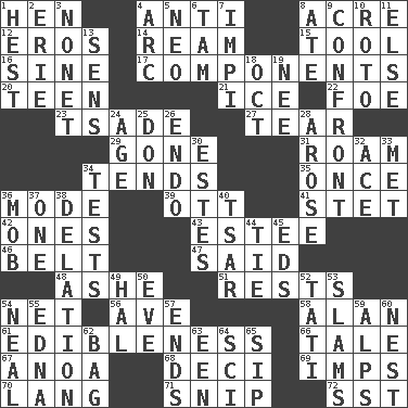 ACROSS 1. Layer 4. Opposed to 8. 1/640 square mile 12. Greek god of love 14. 480, 500 or 516 sheets of paper 15. Utensil 16. Trig term 17. Parts 20. Adolescent 21. Frozen water 22. Enemy 23. Sadhe (variant) 27. Lacerate 29. Went 31. Wander 34. Watches over 35. Single time 36. Method 39. Baseball player Mel 41. Proofreading order 42. Singles 43. First name in cosmetics 46. Waist strap 47. Stated 48. American tennis player Robert 51. Musical pauses 54. Fish or hair follower 56. "___ Maria" 58. ____ Jay Lerner 61. The property of being fit to eat 66. Lie 67. Small Philippine buffalo 68. Tenth: prefix 69. Naughty children 70. Austrian-born American filmmaker Fritz 71. Sever or remove by pinching or nipping 72. Fast jet (abbr.) DOWN 1. Command 2. 4th largest of the Great Lakes 3. Music written for nine 4. Curve 5. Modern: prefix 6. Scottish cap 7. Body of Kaffir warriors 8. Had dinner 9. Meet 10. Printing process, for short 11. Otherwise 13. Elected reps. 18. Sep. follower 19. Born 24. Personal question 25. Spanish title 26. Inside; within (prefix) 28. Came up 30. _____ Park, CO 32. Adept person 33. Was introduced to 34. Trials 36. Disorderly crowd 37. Single 38. Accusation by an informer 40. Russian ruler of old 44. Make a knot 45. Begley and Asner 49. Actor Linden 50. First lady 52. Jacques of French films 53. Shuts with force 54. Actress Patricia 55. Pulitzer Prize-winning author Ferber 57. Conclusions 59. High mountains 60. A home for chicks 62. Paper or plastic container 63. Car or cant ending 64. _-fi 65. Small drink
