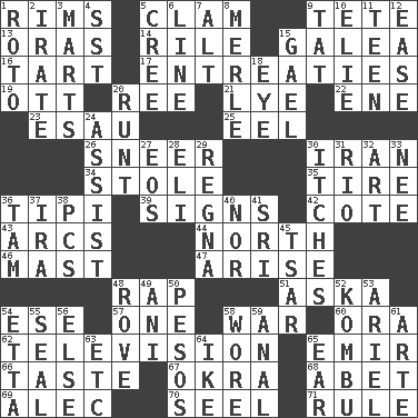 ACROSS 1. Basketball hoops 5. Dollar (slang) 9. Wig 13. Mouths or openings 14. Cause heat under the collar 15. An organ shaped like a helmet 16. Small pie 17. Pleas 19. Baseball player Mel 20. To riddle 21. Sodium hydroxide 22. Compass dir. 23. Son of Isaac 25. Snakelike fish 26. Scornful expression 30. SW Asia republic 34. Fur scarf 35. Hoop that covers a wheel 36. Native american tent (variation) 39. Public displays of written messages 42. ____ d'Azur (French Riviera) 43. Curves 44. 0 degrees 46. Vertical spar for supporting sails 47. Ascend 48. Hit sharply and swiftly 51. "____ silly question..." 54. Compass dir. 57. Single 58. Armed conflict 60. Mouth or opening 62. Household entertainment appliance 65. Arab leader 66. Clothes sense 67. Gumbo ingredient 68. Collude with 69. Actor Baldwin 70. Stitch closed the eyes of (a falcon) 71. General guideline DOWN 1. Printing process, for short 2. Feeling or showing extreme anger 3. Shops 4. Fast jet (abbr.) 5. Algonquian 6. Actor's bit 7. Keyboard modifier key 8. Haggard of country music 9. Make lace 10. Writer Wiesel 11. Adolescent 12. Comfort 15. Highlander 18. Sight organ 20. Undersized animal 24. Help 27. Greek goddess of the dawn 28. Biblical high priest 29. Canadian anthropologist Darnell 30. Irritating cutaneous sensations 31. River (Sp.) 32. Nonscientific branch of learning 33. Born 36. Scottish cap 37. Retirement account (abbr.) 38. Personal Computers (abbr.) 40. Or not 41. _ Lanka 45. Russian ruler of old 48. Be footloose 49. Cuckoo 50. Mexican monetary units 52. Dried seaweed eaten as food 53. Satellite of Uranus 54. Singer James 55. Lick closed 56. Otherwise 58. Had on 59. Of or related to the anus 61. Johnson of "Laugh-In" 63. And so on (abbr.) 64. Mamie's husband 65. Ewer handle