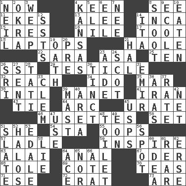 ACROSS 1. Immediately 4. Peachy ____! 8. Perceive with the eye 11. Makes supply last 13. Toward shelter 14. South American Indian 15. Angers 16. The longest river in the world 17. A blast of a horn 18. Portable computers 21. White Person, in Hawaii 22. "Two Mules for Sister ____" 23. White ___ sheet 25. "___ Little Indians" 26. Fast jet (abbr.) 29. One of the two male reproductive glands 32. Arrive at 34. Wedding promise 35. Third mo. 38. International (abbr.) 39. French painter Edouard 41. SW Asia republic 43. Neckwear 44. Curve 45. A salt of uric acid 46. French bagpipes 50. Put into a specified state 51. A female animal or person 54. R.R. building 55. I made a mistake 57. Dipping utensil 59. Heighten or intensify 63. Jai ____ 64. Of or related to the anus 67. Baltic tributary 68. Lacquered or enameled metalware 69. ____ d'Azur (French Riviera) 70. Afternoon social gatherings 71. Compass dir. 72. Part of Q.E.F. 73. "We ___ not amused" (Victoria) DOWN 1. Famous astronaut Armstrong 2. Gumbo ingredient 3. Shed a tear 4. Sunflower state 5. Biblical high priest 6. Snakelike fish 7. Born 8. Snout, nose 9. Learning spot: Fr. 10. Ingested 12. Fast planes 14. Call ___ day 19. Pledge 20. Before (prefix) 21. Actor Linden 23. Assistant 24. Highlander 26. Indian title of respect (Mr.) 27. Emitted 28. Jacques of French films 30. A color or tint 31. Independent ruler or chieftain 33. Clement's nick name 36. Caspian sea tributary 37. Assign a rank or rating to 39. Vertical spar for supporting sails 40. Length times width 42. Fish or hair follower 45. United States Postal Service (abbr.) 47. Purpose 48. Bathroom plumbing fixture 49. Age 51. Chalkboard 52. Rings 53. Peak District village in England 56. Blemish 58. Untruth 60. It may be bright or harebrained 61. Rump 62. Celtic language 64. Adept person 65. Or not 66. "One Day ___ Time"