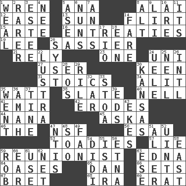 ACROSS 1. Songbird 5. Santa ___, CA 8. Mountain range southwest of Kyrgyzstan 12. Comfort 13. Player for Phoenix 14. Talk or behave amorously 15. Johnson of "Laugh-In" 16. Pleas 19. Area sheltered from the wind 20. More lively and spirited 21. Have trust in 23. Single 24. Corn or form start 27. One who uses or employs something 30. Peachy ____! 31. Unemotional ones 34. Came down and settled, as after flight 35. Electrical Unit 38. Schedule 40. 1994 drama film starring Jodie Foster 41. Arab leader 42. Eats (away) 44. Grandmother 45. "____ silly question..." 46. Definite Article 47. Overdraft (abbr.) 50. He sold his birthright 53. Sycophants 57. Falsehood 59. One who advocates reunion 63. Pulitzer Prize-winning author Ferber 64. Fertile tracts in a desert 65. Daniel's nick name 66. Puts into a specified state 67. Cy Young winner Saberhagen 68. Retirement account (abbr.) 69. Part of Q.E.F. DOWN 1. Welt 2. More valued for its uncommonness 3. First name in cosmetics 4. Born 5. Toward the sea 6. Religious women 7. Pismires 8. The first octave above the treble staff 9. Cards in a Roman deck? 10. "We ___ not amused" (Victoria) 11. It is 14. Conductor's collection 17. _ de Janeiro 18. Car or cant ending 20. System (abbr.) 22. A period of five years 24. Ubangi River tributary 25. Famous astronaut Armstrong 26. International (abbr.) 28. Greek goddess of the dawn 29. Cause heat under the collar 30. Sunflower state 32. Auto 33. Portico 35. Left 36. Wet nurse 37. Prong on a fork 39. Begley and Asner 43. Supplements with great effort 47. Nuclear Threat Initiatives 48. "Barney Miller" actor Jack 49. Avid follower 51. Tree or shrub in the Birch family 52. National forest in Provo, Utah 54. "You Light Up My Life" star Conn 55. Austrian river, tributary to the Danube 56. Inactive volcano in Sicily 58. Compass direction 59. Director Reiner 60. Hearing organ 61. Purpose 62. Fish or hair follower 63. Compass dir.