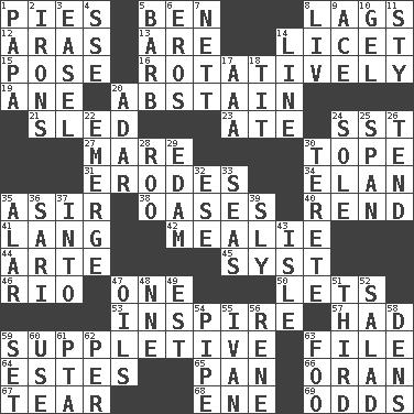 ACROSS 1. Sliced desserts 5. Benjamin's nick name 8. Fails to keep up a pace 12. Ancient river in northeast Turkey 13. "We ___ not amused" (Victoria) 14. It is permitted: Lat. 15. Introduce or present, as a question 16. Happening in regular succession 19. One (Scot) 20. Choose not to consume 21. Downhill vehicle 23. Had dinner 24. Fast jet (abbr.) 27. Female horse 30. Drink excessively 31. Eats (away) 34. Style 35. SW Saudi Arabia district 38. Fertile tracts in a desert 40. Tear apart 41. Austrian-born American filmmaker Fritz 42. Ear of corn 44. Johnson of "Laugh-In" 45. System (abbr.) 46. River (Sp.) 47. Single 50. Allows 53. Heighten or intensify 57. Possessed 59. Supplementary 63. Do some clerical work 64. _____ Park, CO 65. Baking dish 66. Northwest Algerian city 67. Pull into pieces 68. Compass dir. 69. Likelihood DOWN 1. Dad 2. Removes the wrinkles 3. Artist's stand 4. Compass dir. 5. Sharp remark 6. Greek god of love 7. Remaining after all deductions 8. 54 in ancient Rome 9. Adept person 10. Set 11. Filthy place 14. Actor's bit 17. Auto club (abbr.) 18. Teat (slang) 20. The sixth month of the Jewish calendar 22. Develop 24. Not divided or shared with others 25. Connect, as a bridge 26. Watch over 28. Friend of Pooh 29. Dutch treat 30. Cigar-shaped 32. Compass dir. 33. Oceans 35. Having or resembling wings 36. Indian skirt 37. To the inside or interior of 39. Roguish 43. Capri or Wright 47. Lubricates 48. Compass dir. 49. Eastern Standard Time (abbr.) 51. One of three equal parts 52. First course 54. Corncob 55. "Terrible" tsar 56. French philosopher Descartes 58. Hiding places for outlaws 59. Arrange properly for use 60. Purpose 61. Parent Teacher Assoc. 62. For each 63. Egg _ yung