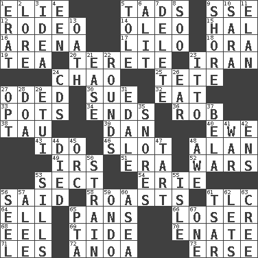 ACROSS 1. Writer Wiesel 5. Small boys 9. Compass dir. 12. Cowboy competition 14. Butter sub 15. Actor Linden 16. Sports stadium 17. _ and Stitch 18. Mouth or opening 19. Afternoon social gathering 20. Cigar-shaped 23. SW Asia republic 24. US Secretary of Labor Elaine L. _ 25. False hair 27. Wrote a lyric poem 30. Institute legal proceedings 32. Consume 33. Plant holders 34. Extremities 36. Director Reiner 38. The 19th letter of the Greek alphabet 39. One of the 12 tribes of Israel 40. She-sheep 43. Wedding promise 46. Groove 48. Actor Alda or Thicke 49. Big collection agency 51. Period 52. Armed conflicts 53. Religious group 54. One of the Great Lakes 56. Expressed in words 58. Ridicules or criticizes harshly 61. Affectionate concern, for short 64. Pipe bend 65. Zero-star reviews 66. Failure 68. Snakelike fish 69. Periodic rise and fall of the sea level 70. Related on the mother's side 71. French article 72. Small Philippine buffalo 73. Celtic language DOWN 1. Part of Q.E.F. 2. Old wives' tales, e.g. 3. The main thing one is thinking about 4. Car or cant ending 5. Lacquered or enameled metalware 6. Came down and settled, as after flight 7. Erase 8. "Barney Miller" actor Jack 9. Dinah or Pauly 10. "Two Mules for Sister ____" 11. Liveliness 13. Pledge 21. Relaxation 22. Periods in a boxing match 23. "Tell ____ the Marines!" 24. Music discs 26. Hearing organ 27. Elect 28. ___ good deed 29. Needle holder 31. Peak District village in England 35. Sounds asleep 37. Actor Lugosi 41. Armed conflict 42. Followers of ems 44. Passed on 45. The grampus (Milton) 47. Small pie 48. Deep reverence 50. Put through a sieve 53. Beverly of Met fame 55. Capri or Wright 56. Sew up the eyelids of hawks and falcons 57. Toward shelter 59. Southwest Nigerian state 60. Toward the sea 61. Russian ruler of old 62. Allows 63. Algonquian 65. Parent Teacher Assoc. 67. Single
