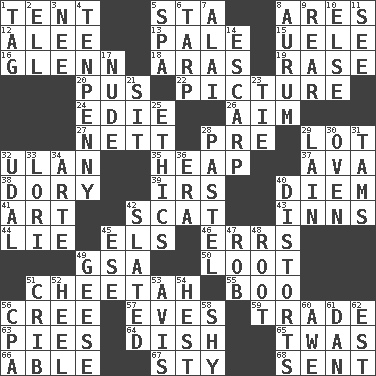 ACROSS 1. Portable shelter 5. R.R. building 8. Ancient Greek god of war 12. Toward shelter 13. Light colored 15. Ubangi River tributary 16. American astronaut and politician John 18. Ancient river in northeast Turkey 19. To erase 20. Suppuration 22. Photo 24. Singer Brickell 26. Direct toward a target or goal 27. Remaining after all deductions 28. Before (prefix) 29. Car dealer's back yard 32. ____ Bator 35. Pile 37. Actress Gardner 38. Dinghy 39. Big collection agency 40. South Vietnam president (1954) 41. Nonscientific branch of learning 42. Go away! 43. Lodging establishments 44. Falsehood 45. Raised railways 46. Blunders 49. Girls' org. (abbr.) 50. Plunder 51. Leopard's kin 55. Sometimes accompanies a hiss 56. Algonquian 57. Nights before holidays 59. Barter 63. Sliced desserts 64. Food container 65. It was, poetically 66. Competent 67. Filthy place 68. Transmitted DOWN 1. Label 2. Pipe bend 3. Born 4. 3-inch nail 5. Health resort 6. Canvas cover 7. Jai _ 8. Gold (Symbol: Au) 9. Tail end 10. Otherwise 11. Perceive with the eye 14. Fortification 17. Naked 21. Be seated 23. Neckwear 25. Principles of right and wrong 28. Soft color 29. (Had) reclined 30. Baking chamber 31. Scottish caps 32. Hereditary estate 33. Australian parrot (variant) 34. Johnson of "Laugh-In" 36. Period 40. What propaganda does 42. Scheduled 45. Compass dir. 47. Director Reiner 48. Carrot, for example 49. Honkers 51. Baby bed with high sides 52. The bottom of a shoe or boot 53. Opinion 54. Behest 56. Tax preparer (abbr.) 58. Like a shrinking violet 60. Deep reverence 61. Daniel's nick name 62. Eastern Standard Time (abbr.)