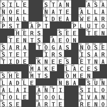 ACROSS 1. Drop; flow; fall 5. Comedian Laurel of Laurel & Hardy 9. White ___ sheet 12. Christmas carol 13. Nathan's nickname 14. Silent film actress Nazimova 15. Of or related to the anus 16. It may be bright or harebrained 17. Erode 18. Pacific Standard Time (abbr.) 19. Fitting 21. Cartoon dog 22. Possessive pronoun 24. Perceive with the eye 26. Nine, plus one 27. Portable shelters 28. Period of immesurable duration 29. "Two Mules for Sister ____" 30. Ancient Roman robes 32. Olfactory organ 36. Proofreading order 37. Big collection agency 38. Austrian river, tributary to the Danube 39. Event that recurs at intervals 40. Leg joints 42. Inactive volcano in Sicily 43. Create 44. Shoestrings 46. A female animal or person 49. Mountains (abbr.) 50. Sign of something about to happen 51. Dipping utensil 53. Basketball assoc. 54. Player for Phoenix 57. Mountain range southwest of Kyrgyzstan 58. Opposed to 61. Grain storage tower 62. Lacquered or enameled metalware 63. Utensil 64. _ the terrible 65. Compass dir. 66. Johnson of "Laugh-In" 67. Former U.S. Attorney General Janet DOWN 1. Fastener 2. Charged atoms 3. Tough but pliablecoriaceous 4. Pipe bend 5. In a ____ (agitated or irritated) 6. Bit 7. Had dinner 8. Teachers' org. 9. Native American of Southwest Alaska 10. Chalkboard 11. Composer Copland 14. Leather borer 19. Nonscientific branch of learning 20. Inconspicuous attention getter 21. Writing instrument 23. Related on the mother's side 24. Gospel singer Marvin 25. Greek goddess of the dawn 27. Jacques of French films 28. Match 29. Fast jet (abbr.) 31. Pig sounds 32. Sibling's daughter 33. Clearly or manifestly demonstrative 34. Without 35. Period 40. Krazy ___ of comics 41. Messy guy 43. Madame (abbr.) 45. Wet nurse (var.) 46. Narrow boards 47. Saint headwear 48. Peak District village in England 52. Untruth 53. "Death on the ____" 55. ____ Bator, Mongolia 56. Words to Nanette 58. "One Day ___ Time" 59. Or not 60. Small child 61. Title for a knight
