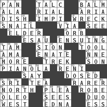 ACROSS 1. Baking dish 4. Baby powder 8. Lip ointment 12. Insect wing 13. Monetary unit of Yemen 14. Operatic vocal solo 15. Food container 17. Body of Kaffir warriors 18. Raze 19. Slow-paced one 21. By way of 23. Observe 24. A person who is older than you are 26. Globe 28. Son of Isaac 30. Taking place subsequently 34. Scottish cap 37. The Jewish people; Israel 39. Implement 40. Nanny (var.) 41. Related on the mother's side 43. Compass dir. 44. Greater amount 46. Long journey 47. Male child 48. Player piano 51. Painter Guido (1575-1642) 54. Declare 55. Administered medicine 58. _ Lanka 61. Afternoon social gathering 63. Less widely known 65. 0 degrees 67. Entreaty 71. Loose flowing garment 72. Margarine 73. Observes 74. Superhero pair 75. 270 degrees 76. Pulitzer Prize-winning author Ferber 77. Double-curved letter DOWN 1. Groovy apts. 2. Place in a line 3. Rhinal 4. Three (prefix) 5. Direct toward a target or goal 6. Infant locale 7. 154 in Roman numerals 8. Drinking establishment 9. Ancient Greek god of war 10. Louse (plural) 11. Create 16. Flintstone garb 18. Armed conflicts 20. French article 22. Electrically charged atom 25. Raze (variant) 27. On the contrary 29. National forest in Provo, Utah 30. Keyboard key 31. Charged atoms 32. Words to Nanette 33. Small, secluded valley 34. Pack (down) 35. Mine, in Marseilles 36. Hindu Mythology: god of death 38. Boat paddle 42. Made supply last 45. Followers of ems 49. Pledge 50. Potassium hydroxide 52. And not 53. Austrian river, tributary to the Danube 56. Wear away 57. Alight from a bus 58. Frozen precipitation 59. Hero or heavy, e.g. 60. Angers 62. Domed church section 64. Vintage cars 66. Small child 68. Directed 69. Car or cant ending 70. White ___ sheet
