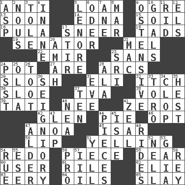 ACROSS 1. Opposed to 5. Rich soil 9. Legendary monster 13. Within a short period 14. Pulitzer Prize-winning author Ferber 15. Land 16. Monetary unit of Botswana 17. Scornful expression 18. Small boys 19. Elected representative 21. Cartoonist voice _ Blanc 22. Arab leader 23. Without 24. Cooking vessel 27. "We ___ not amused" (Victoria) 28. Arches 29. Agitate, as a liquid 31. Connecticut Ivy Leaguer 32. Hankering 36. A type of plum 37. Federal power corp. 38. Grand slam 39. Jacques of French films 40. Born 41. Nothings 42. Small, secluded valley 44. Sliced dessert 46. Elect 47. Small Philippine buffalo 48. Austrian river, tributary to the Danube 50. Mouth edge 51. Crying or shouting loudly 54. Redecorate 56. Component 58. Letter starter 60. One who makes use of a thing 61. Cause heat under the collar 62. Writer Wiesel 63. Suggestive of the supernatural 64. Lubricates 65. Kill DOWN 1. Viper 2. Common sense 3. Lacquered or enameled metalware 4. Silly 5. Poe poem 6. Baltic tributary 7. One (Scot) 8. Spoil 9. Clearly or manifestly demonstrative 10. Purposes of endeavors 11. To free from 12. Raised railways 17. Disorderly outburst 20. Nanny 21. Apple computer (short form) 23. _ Lanka 24. Inconspicuous attention getter 25. Rounded earthenware pot or jar 26. A blast of a horn 28. According to 30. Signiory (variant) 31. First lady 33. "Corrida" creature 34. Hoof sound 35. Behest 37. "___ Little Indians" 40. Teachers' org. 41. Ardor 43. Trim (branches) 44. Components 45. Capri or Wright 47. Tree or shrub in the Birch family 49. Amusement-park features 51. Shout 52. 1994 drama film starring Jodie Foster 53. Greek goddess of the earth (variant) 54. Sorrow 55. Compass dir. 56. Adept person 57. One more than two 59. Marina Del _, California