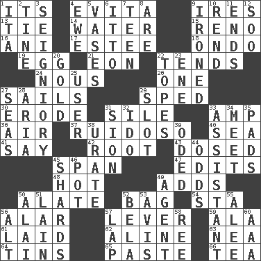 ACROSS 1. ___ a Wonderful Life 4. Webber/Rice musical 9. Angers 13. Make a knot 14. Wetness 15. Western Nevada city 16. Cuckoo 17. First name in cosmetics 18. Southwest Nigerian state 19. Ovum 21. Age 22. Watches over 24. Horse sense 26. Single 27. Moves on water 29. Broke a traffic law 30. Eat (away) 31. Filth; sediment 33. Electrical Unit 36. Wind 37. Boisterous (Brazilian Portuguese) 40. Ocean 41. Declare 42. Carrot, for example 43. Administered medicine 45. Connect, as a bridge 47. Proofreads 48. Being at a high temperature 49. Does sums 50. Having winglike extensions 52. Paper or plastic container 54. R.R. building 56. Having or resembling wings 57. Prying instrument 59. Chicken ___ king 61. Put down 62. Place in a line 63. Teachers' org. 64. Canisters 65. Thick mixture 66. Afternoon social gathering DOWN 1. Call ___ day 2. Prong on a fork 3. Signiory (variant) 4. She-sheep 5. Flower holders 6. "Tell ____ the Marines!" 7. Adolescent 8. "We ___ not amused" (Victoria) 9. Pressed 10. Tear apart 11. Conclusions 12. "Barney Miller" actor Jack 20. Gilded 22. Drinks excessively 23. Compass dir. 25. One who uses or employs something 27. Oceans 28. Operatic vocal solo 29. Slit 31. The Jewish people; Israel 32. Wedding promise 33. Helper 34. Confront 35. Writing tablets 38. A salt of uric acid 39. Wrote a lyric poem 44. Likelihood 45. Pottery fragments 46. Plant holder 49. Rep 50. Jai ____ 51. (Had) reclined 52. Actor Lugosi 53. Opinion 55. Toward shelter 56. Keyboard modifier key 57. Infant locale 58. To sift 60. Auto club (abbr.)