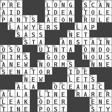 ACROSS 1. Before (prefix) 4. Having great length 8. Skim 12. Assist 13. The content of cognition 14. Lacquered or enameled metalware 15. Leg coverings 18. Period of immesurable duration 19. General guideline 20. Those who practice law 22. Pet locale 23. Backtalk 24. Fish or hair follower 25. R.R. building 26. Choose not to consume 30. Bear (Spanish) 33. National forest in Provo, Utah 36. Southwest Nigerian state 37. Basketball hoops 39. Thick or sticky substance 40. Horse sense 41. Afresh 42. Typical standards 44. Compass dir. 45. Legislator 47. Binary compound 50. ___ Haven, CT 51. Allows 53. Insect wing 54. Pertaining to the sea 57. Silent film actress Nazimova 59. Actor's bit 61. Less widely known 63. Path through which fluid escapes 64. River in Europe 65. Compass dir. 66. Prong on a fork 67. Mail 68. Filthy place DOWN 1. Infant food 2. Monetary unit of Yemen 3. Ferber et al. 4. One who doesn't tell the truth 5. Lyric poems 6. Modern: prefix 7. Separate the seeds from cotton 8. Ski resort town in Vermont 9. Overturn; upset 10. 100% 11. Born 16. It was, poetically 17. System (abbr.) 21. Son of Isaac 22. French article 24. Basketball assoc. 26. Smallest unit of an element 27. At once, immediately (arch.) 28. Goddess of spring and wife of Bragi 29. Characteristic smell of wine 30. Mouths or openings 31. Trig term 32. Presage 34. Composer Stravinsky 35. And not 38. Tchaikovsky ballet 42. At this time 43. Drop; flow; fall 46. Afternoon social gathering 48. Letter starter 49. Inactive volcano in Sicily 52. Male parents of animals 53. ____ Jay Lerner 54. Singles 55. Certainty 56. Penny 57. Keyboard modifier key 58. Flowery wreath 59. Chop off 60. Wedding promise 62. Marina Del _, California