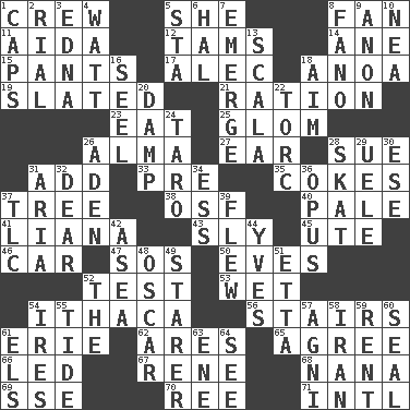 ACROSS 1. Group working together 5. A female animal or person 8. Avid follower 11. Opera by Verdi 12. Scottish caps 14. One (Scot) 15. Leg coverings 17. Actor Baldwin 18. Small Philippine buffalo 19. Scheduled 21. Food allowance for one day 23. Erode 25. Take by theft 26. _ mater 27. Hearing organ 28. Institute legal proceedings 31. Say or write further 33. Before (prefix) 35. Popular sodas 37. Family _ (genealogy) 38. Order of Saint Francis (abbr.) 40. Diluted with white 41. Climbing, woody, usually tropical vines 43. Secret 45. Shoshoni 46. Automobile 47. Distress signal 50. Nights before holidays 52. Trial 53. Soggy 54. New York city 56. Flight of steps 61. One of the Great Lakes 62. Ancient Greek god of war 65. Match 66. Directed 67. French philosopher Descartes 68. Nanny 69. Compass dir. 70. To separate or throw off 71. International (abbr.) DOWN 1. Balmoral and tarboosh 2. Monetary unit of Yemen 3. Pulitzer Prize-winning author Ferber 4. Electrical Unit 5. R.R. building 6. Actor Linden 7. Develop 8. Papal veil 9. At once, immediately (arch.) 10. Teachers' org. 13. Any of the three canals of the cochlea 16. Stitch closed the eyes of (a falcon) 18. Direct toward a target or goal 20. Moist 22. Torque (variant) 24. Edible starchy tuberous root 26. Arabian gulf 28. Three-handed card game 29. Ubangi River tributary 30. Compass dir. 31. Operatic vocal solo 32. Letter starter 34. Curvy letter 36. Musical composition 37. Affectionate concern, for short 39. Soared 42. Toward the sea 44. Jacques Cousteau's middle name 48. Witty Wilde 49. A viewer who gazes fixedly 51. Singer James 52. Definite Article 54. Angers 55. Periodic rise and fall of the sea level 57. Hindu god of fire 58. SW Asia republic 59. Monthly bill 60. Lick closed 61. Raised railways 63. Compass dir. 64. Observe
