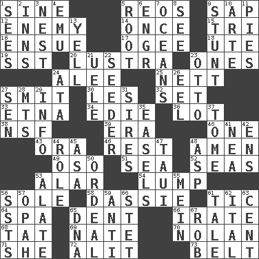 ACROSS 1. Trig term 5. Vintage cars 9. Plant excrement 12. Foe 14. At one time in the past 15. Three (prefix) 16. Follow as a consequence or result 17. Double curve, resembling the letter S 18. Shoshoni 19. Fast jet (abbr.) 20. A period of five years 23. Singles 24. Toward shelter 25. Remaining after all deductions 27. Stricken, poetically 30. French article 32. Put into a specified state 33. Inactive volcano in Sicily 34. Singer Brickell 36. Car dealer's back yard 38. Science/research agcy. 39. Epoch 40. Single 43. Mouth or opening 46. Remainder 48. So be it 49. Bear (Spanish) 51. Ocean 52. Oceans 53. Having or resembling wings 54. Mass 56. Flatfish 58. Small ungulate mammals of Africa 61. Nervous spasm 64. Health resort 65. Incision 66. Feeling or showing extreme anger 68. Make lace 69. Nathan's nickname 70. Pitcher Ryan 71. A female animal or person 72. Came down and settled, as after flight 73. Waist strap DOWN 1. Perceives with the eye 2. Lodging establishments 3. A home for chicks 4. Australian flightless bird 5. Carrot, for example 6. Engineer (abbr.) 7. Seas 8. Observe 9. Check the growth or development of 10. Johnson of "Laugh-In" 11. Sliced desserts 13. Shout 21. Ubangi River tributary 22. Sowing specialist 23. Von Bismarck 24. "One Day ___ Time" 26. Snakelike fish 27. Elected rep. 28. Mountains (abbr.) 29. A message received and understood 31. Titles for men of rank and authority 35. Artist's stands 37. Heavy book 41. Teachers' org. 42. Followers of ems 44. Hero or heavy, e.g. 45. White ___ sheet 47. "Change" in Tahitian 48. Viper 50. Severe or trying experience 53. Having winglike extensions 55. Count _ (2 wds.) 56. Fast planes 57. Brightly colored fish 59. Opposed to 60. Proofreading order 61. Story 62. Slanted text style (abbr.) 63. Penny 65. Heredity factor (abbr.) 67. Director Reiner