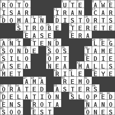 ACROSS 1. Printing process, for short 5. Shoshoni 8. Deep reverence 11. Austrian river, tributary to the Danube 12. SW Asia republic 13. 4-wheeled motor vehicle 14. Kingdom 17. What propaganda does 19. Disco prop 21. Cylindrical with tapered ends 22. Comfort 23. Epoch 24. Black tropical American cuckoo 27. Be inclined (to) 29. Part of a journey 32. Something which is sent 34. Distress signal 36. Docile 37. Grain storage tower 38. Choose 39. Singer Brickell 40. Toward the sea 41. Teachers' org. 42. Promenades 43. Was introduced to 44. Cause heat under the collar 46. Sight organ 47. Housemaid (var.) 50. San ____ (Riviera town) 52. Spoke pompously 55. Michaelmas daisies 57. Conveyance 59. Had an oblique or slanted direction 62. Followers of ems 63. Round or rotation of duties 64. Billionth: prefix 65. "Barney Miller" actor Jack 66. Eastern Standard Time (abbr.) 67. Singles DOWN 1. To free from 2. Bear (Spanish) 3. Scottish caps 4. Speak pompously 5. RI univ. 6. Clothes sense 7. Keyboard key 8. Land measure 9. Electrical Unit 10. Celtic language 12. Binary compound 15. Feeling or showing extreme anger 16. Olfactory organ 18. Mouth or opening 20. Gillaume's butler role 24. Indian state 25. Annoying sound 26. An arm off of a larger body of water 28. Drug addict 29. Dipping utensil 30. Poet Dickinson 31. Honkers 33. ___ good deed 35. Flight of steps 36. Afternoon social gathering 42. Klaipeda city 45. Allows 47. _ moment's notice (2 wds.) 48. Distance measurement (Brit.) 49. Goodbye (Sp.) 51. U. of Maine site 52. Lyric poems 53. Former U.S. Attorney General Janet 54. In addition 55. Santa ___, CA 56. Connect, as a bridge 58. Baseball player Mel 60. Compass dir. 61. Two (Sp.)