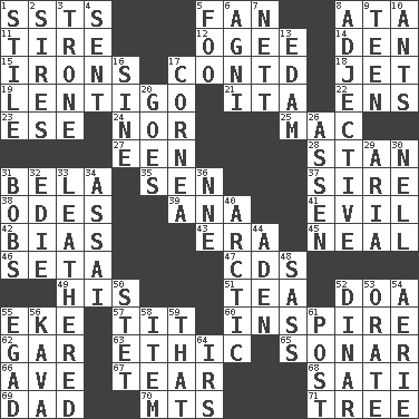 ACROSS 1. Fast planes 5. Avid follower 8. _ moment's notice (2 wds.) 11. Hoop that covers a wheel 12. Double curve, resembling the letter S 14. Lair 15. Removes the wrinkles 17. Continued (abbr.) 18. Passenger plane 19. Small, flat, pigmented spot on the skin 21. Call ___ day 22. Followers of ems 23. Compass dir. 24. Not either 25. Big _ 27. Car or cant ending 28. Comedian Laurel of Laurel & Hardy 31. Actor Lugosi 35. Elected rep. 37. The founder of a family 38. Lyric poems 39. Santa ___, CA 41. Tending to cause great harm 42. Prejudice 43. Period 45. Anneal 46. Bristle 47. Music discs 49. Part of HMS, perhaps 51. Afternoon social gathering 52. ___ good deed 55. Make supply last 57. Teat (slang) 60. Motivate 62. Slender fish 63. Value system 65. Underwater navigation system 66. "___ Maria" 67. Separate forcefully 68. Suttee (variant) 69. Male parent 70. Mountains (abbr.) 71. Relationship diagram DOWN 1. Vertical member of a panel or frame 2. Male parents of animals 3. Marketplace scale 4. Emitted 5. Egg _ yung 6. Hindu god of fire 7. Remaining after all deductions 8. Descriptive word 9. Adolescent 10. Pismires 13. Dutch treat 16. Trig term 17. Pupil covering 20. Travels 26. NE Netherlands city 29. Operatic vocal solo 30. 1994 drama film starring Jodie Foster 31. Moves up and down 32. Singer Brickell 33. Tough but pliablecoriaceous 34. Slender Brazilian palm 36. Compass dir. 40. Northern region 44. An important port of Yemen 48. Backtalk 50. Proofreading order 52. Middle Eastern gold or silver currency 53. Speak pompously 54. Nest on high 55. Mild oath 56. Polynesian shrub of the pepper family 58. Detail 59. Not this but _ 61. Mail 64. Big collection agency